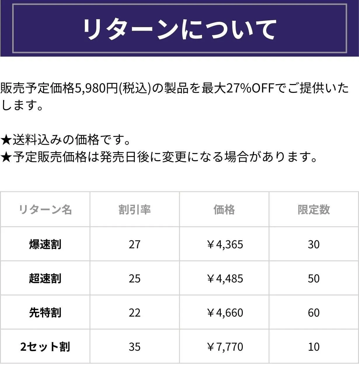 A.予約販売となりますので、 リターン配送日程に基づいた配送日程となります。