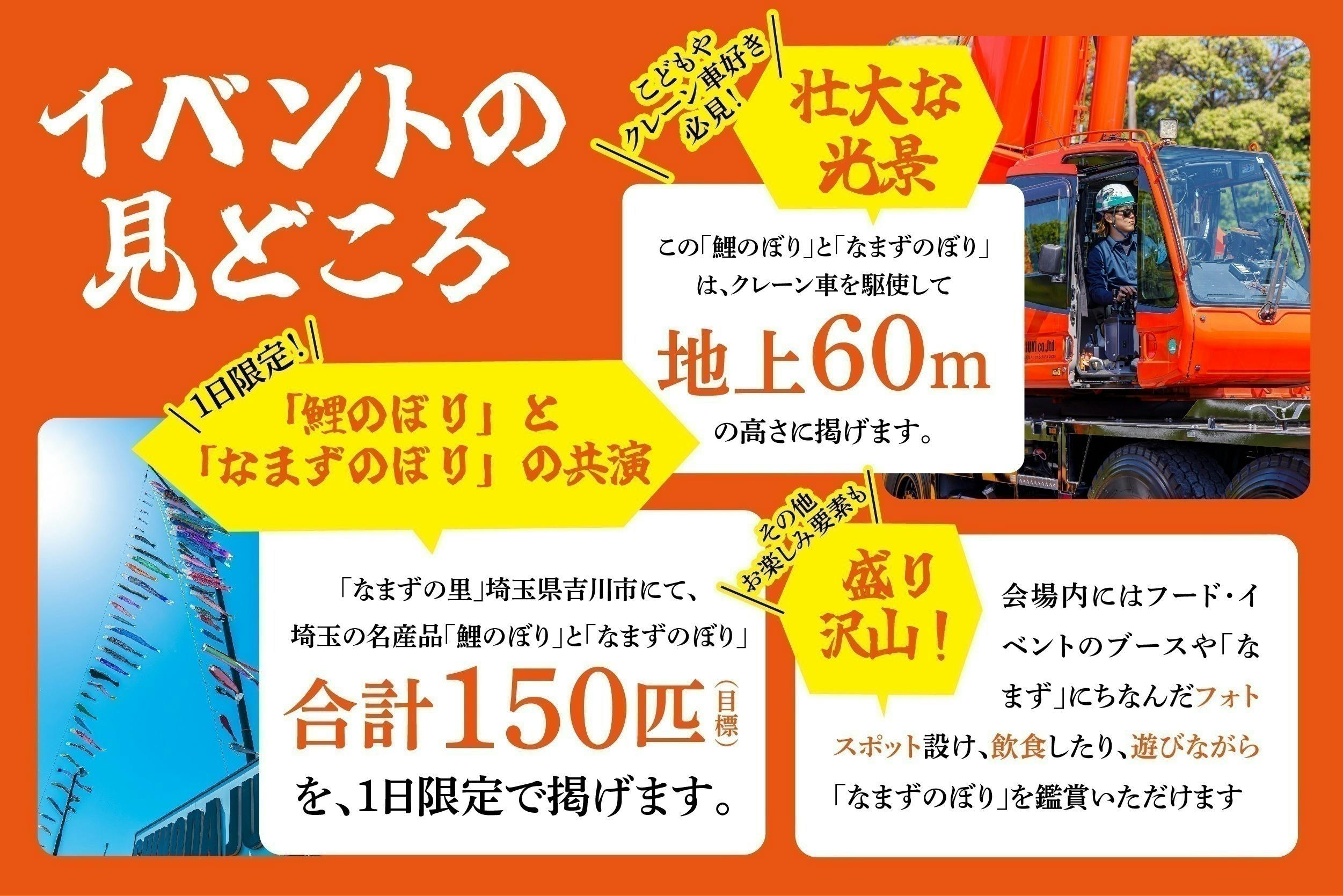 イベント当日様子としては、地上からの写真に加え、高さ60mの上空から撮影した吉川市、三郷市の空に泳ぐなまずのぼりの限定写真を用意します。