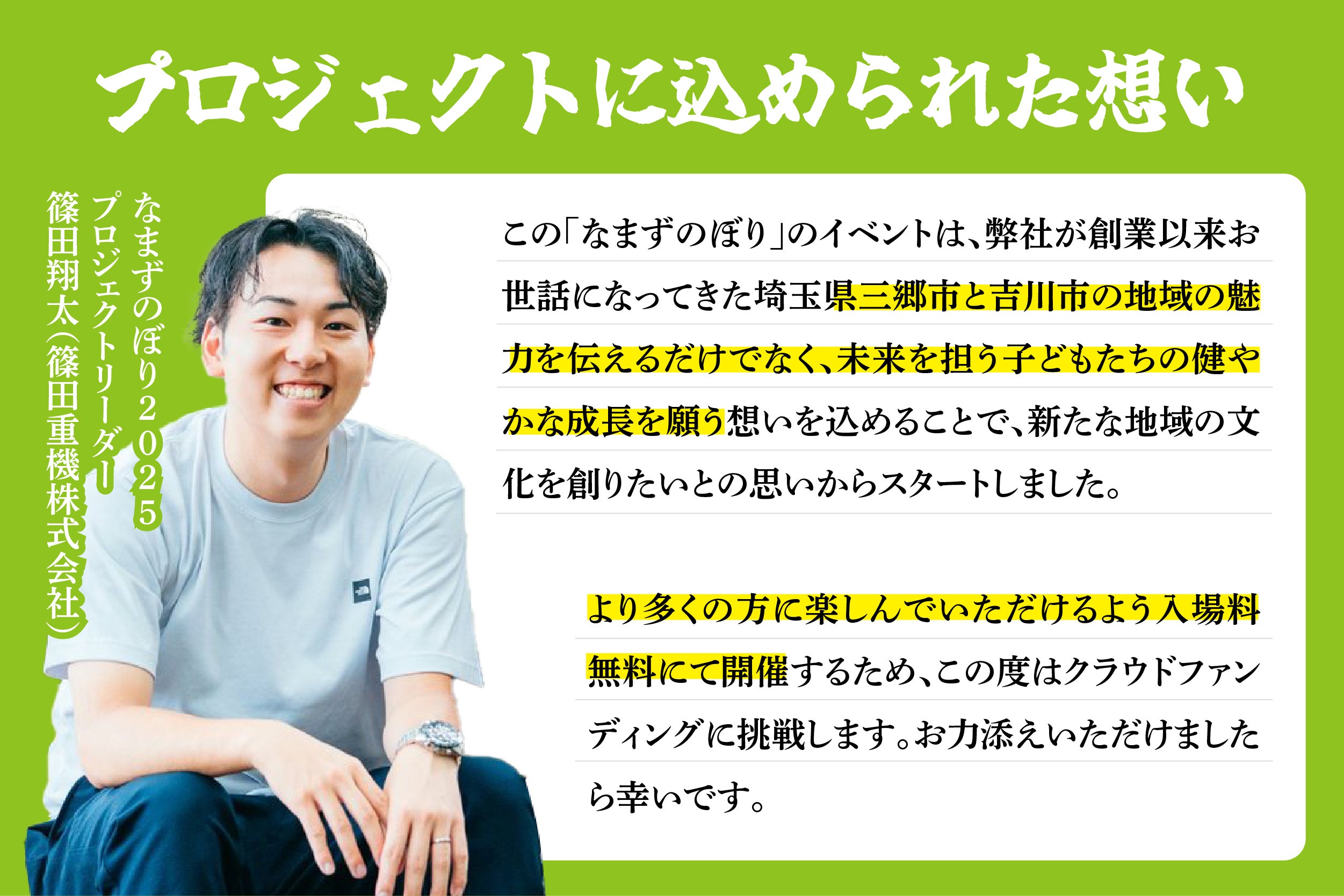2025年5月、埼玉県吉川市、三郷市の空に、「こいのぼり」「なまずのぼり」合わせて約150匹(目標)を大空に掲げ、地域に活力を与えるイベントを開催予定です。