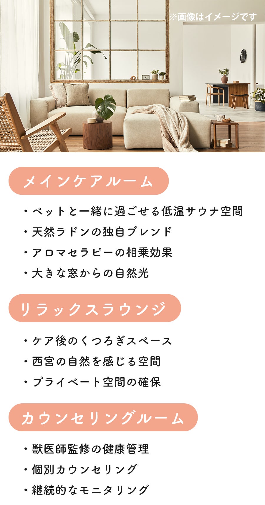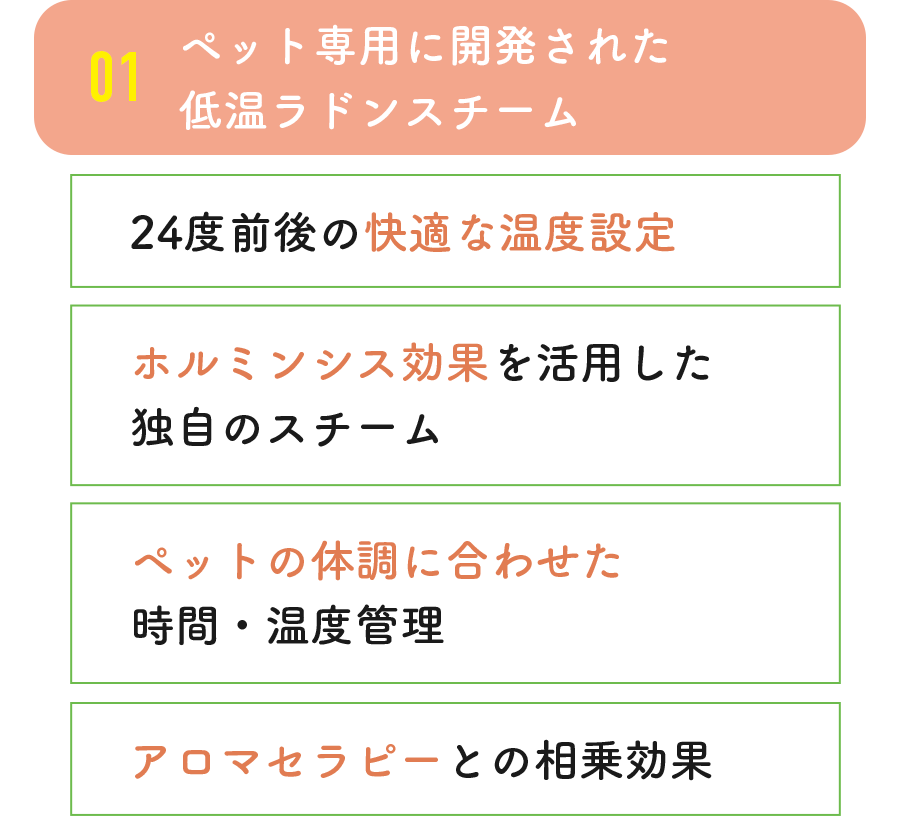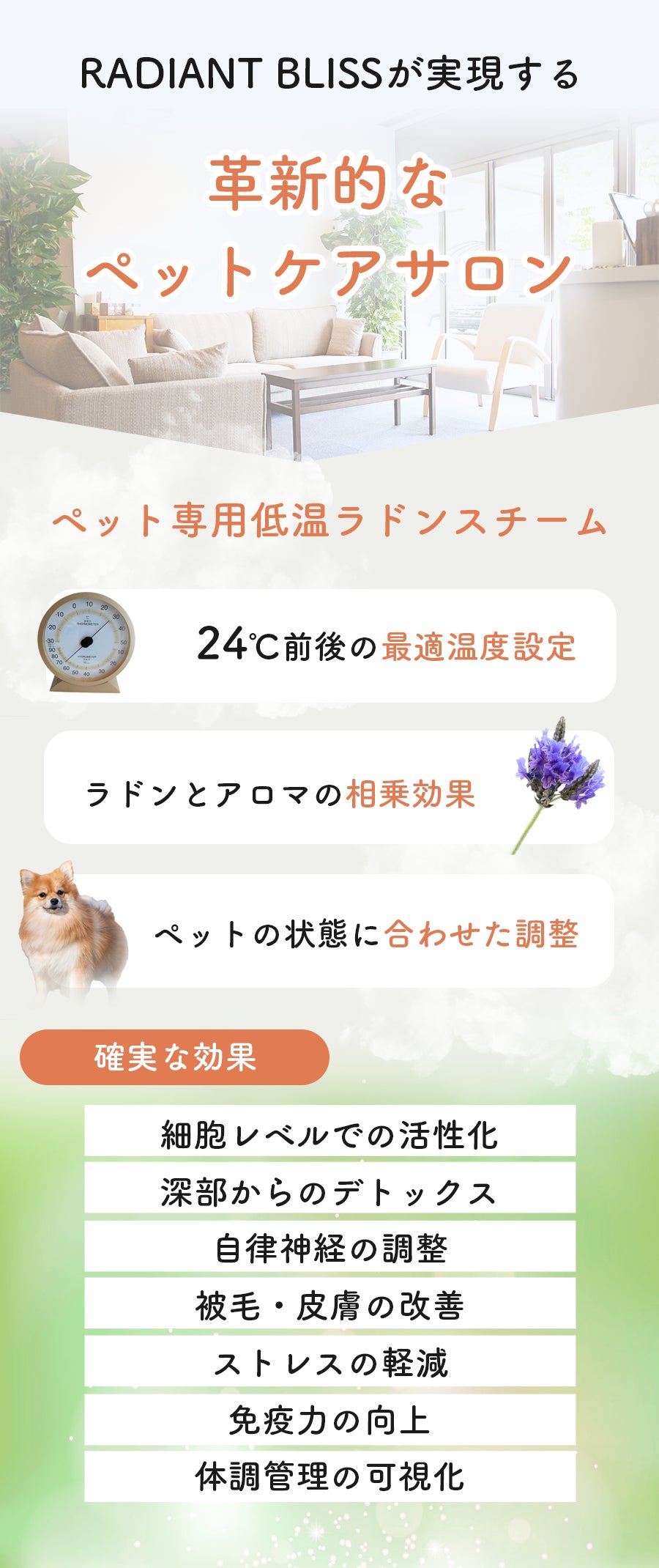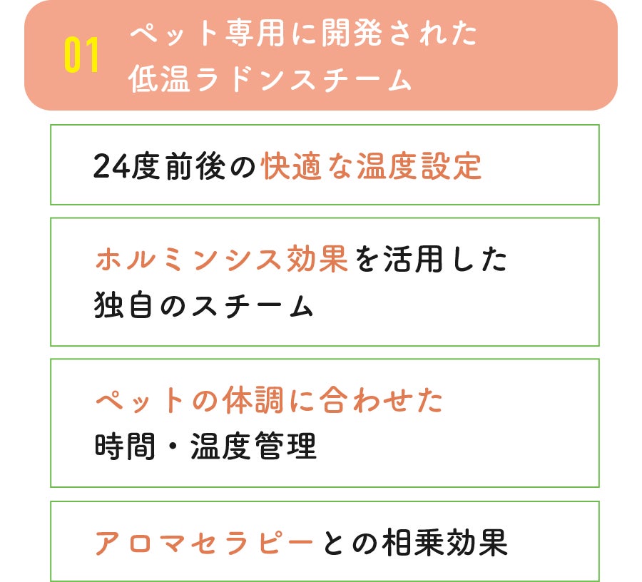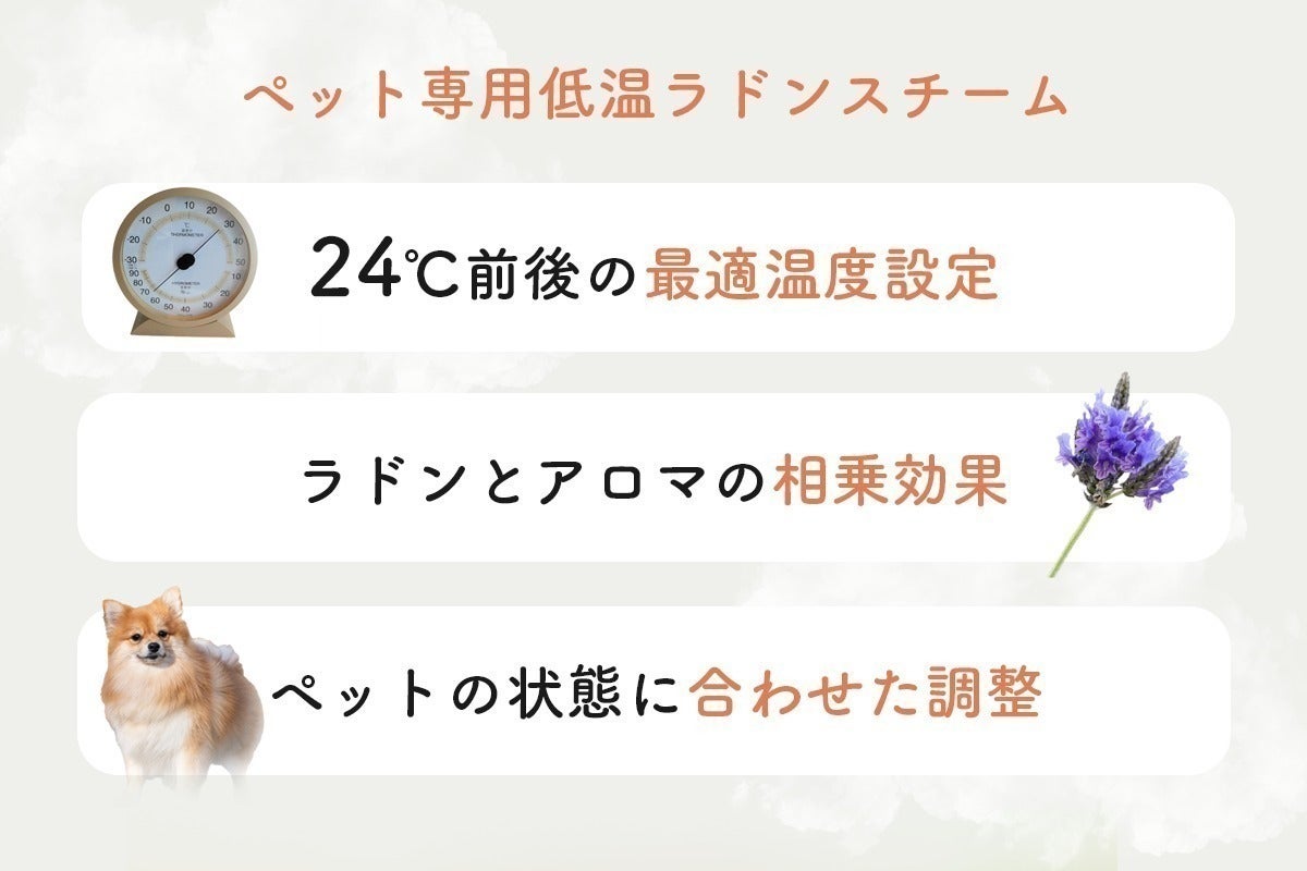 ラドンスチーム×アロマを組み合わせた独自のアプローチで、ペットと飼い主の健康増進と、かけがえのない絆づくりをサポートします。