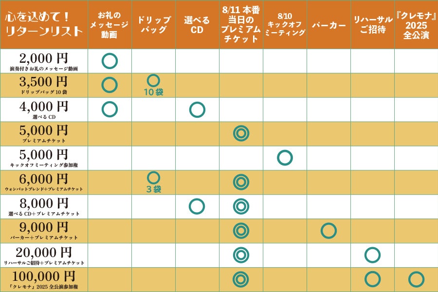 2025/02/19 03:00真夏に開催する「たそがれコンサート」へのクラウドファンディングを現在開催中である。私がバンドマスターを務める『クレモナ』としては初の試みにも関わらず、開始2週間で100パーセントを達成。でも、それから伸び悩みの時期を3日ほど過ごしている。私たちのとっておきを送る「リターン」クラウドファンディングということで、色々な「リターン(返礼品)」をご用意していますが、これは『クレモナ』総力を上げてのチョイスとなりました。『クレモナ』のコーヒーもリターンに。今回のクラファンも、演奏会開催が目標ということで、私のことを「音楽家」だと思ってくださっている方はたくさんおられると思います。実際そうなんですが、さらに私は「コーヒー屋」でもあります。そもそも私は、大阪・池田にあるコーヒー専門店「ルークカフェ」に大学2年生の時からお世話になっており、店長やお客さまをはじめたくさんの人々に育ててもらってきました。大学四年の時から始めた『コーヒー焙煎』の事業(ローストラボ・クレモナ)は、少しずつながらもファンが増えて、音楽活動を下支えできるくらいに成長しています。幼い時より培った『絶対音感』を使った『耳焙煎』は、四季のある日本で、折々に美味しいコーヒーをお届けすることができ、データを軸として焙煎する、(良い意味で)工業製品に近い焙煎ではなく、(これも良い意味で)職人の技、に近いものだと自負しています。ということで、今回はリターンにコーヒーの選択肢も入れました。手軽に、誰が淹れてもおいしく仕上がる(分量・挽き加減もこだわっています)ドリップバッグをどうぞ!幻のコピルアクもコピルアク、というコーヒーもこの度リターンとしてご用意しています。コピルアク、とは、インドネシアに生息する「ジャコウネコ(ルアク)」がコーヒーの実を食べ、排泄物の中に残った種子(コーヒー豆)を脱穀洗浄し、焙煎するという(色んな意味で)珍しいコーヒーです。ジャコウネコのお尻には麝香のかおりを分泌する腺があり、そこを通って出てくる豆に香りがつきます。あまりにも珍しいので世の中にはまがいものが出回っており、コピルアク自体がほとんど入ってないブレンドなのに『コピルアク』とパッケージに書いてあったり、香料をつけたり、猫に無理やり食べさせて出させたり、人間の汚い部分が顕著に出るコーヒーでもあります。そんな中で、きちんとしたライセンスがついた『100%純コピルアク』に出会えるのはかなり珍しいのですが、私たちが取り扱うのは高価であれど『正しいコピルアク』です。ライセンス付き正しさはもちろん美味しさに繋がります。香りの爆発!みたいな陳腐さは微塵もなく、とても品よくバランスが取れていて、押しつけがましくなく、飲む人それぞれにインスピレーションを与えるような感じ…そうですね、サモトラケのニケのような感じ。です。伝わりませんかね(笑)本題:本日お願いしたいこと!ということで、今回、クラウドファンディングにご支援下さった方にお願いをしたいのは、このクラファンをどこでもいいんです、noteでも、ラインでも、Facebookでも、Xでもいいんです、まだ『クレモナ』のことを知らない人がいる場所にそっとリンクだけでも貼っていただけないでしょうか…。リンクはこちら:https://camp-fire.jp/projects/822067/view空中戦ポスター貼りみたいな感じなのですが、「コーヒーも美味しいよ」とコメントをつけていただいてシェアしていただけると、益々嬉しいです。政治やら宗教やらとは違って!とは全く言い難いですが(笑)、怪しさ全開で色がべたべたつくかも知れないのですが!ぜひ、みなさんのSNSの端っこにシェアしていただけると本当にありがたいのです…!何卒よろしくお願い致します。最終コーナーに差し掛かる前にしようとしていること。じゃあ君たちはどうするのか、ということなんですが。①『クレモナといっしょ』というフリー季刊誌を200名の方にお送りします。これは、演奏会にご来場いただいてアンケートにて「クレモナ友の会に入会する」とチェックしていただいた方にもれなく届きます。(ただ、何年も演奏会がご無沙汰な方は優先順位が下がっております。ごめんなさい。)ここに手紙を書いて、熱い思いを乗せて、チラシを挟み、ドリップバッグまで入れてお送りします。木曜日夕方までに仕上げないといけないのでこれは結構たいへんです。②池田市内を5000枚ポスティングします。「ルークカフェ・クレモナ新聞」という新聞の裏面を全面クラファンのチラシに変え、5000枚ポスティングを行います。これは日曜日まで。なるはやに終わらせたいのですが、どうなることやら…。一人でも多くの方の目に留まりたいんです!③チラシ配りを続投します。演奏会終了後のチラシ配り。これね。今回はやっぱり「クラウドファンディング」が前面に出ているから、怪しさがあるみたいで、普通の公演チラシより反応が悪いです。相当。でも、誰かが