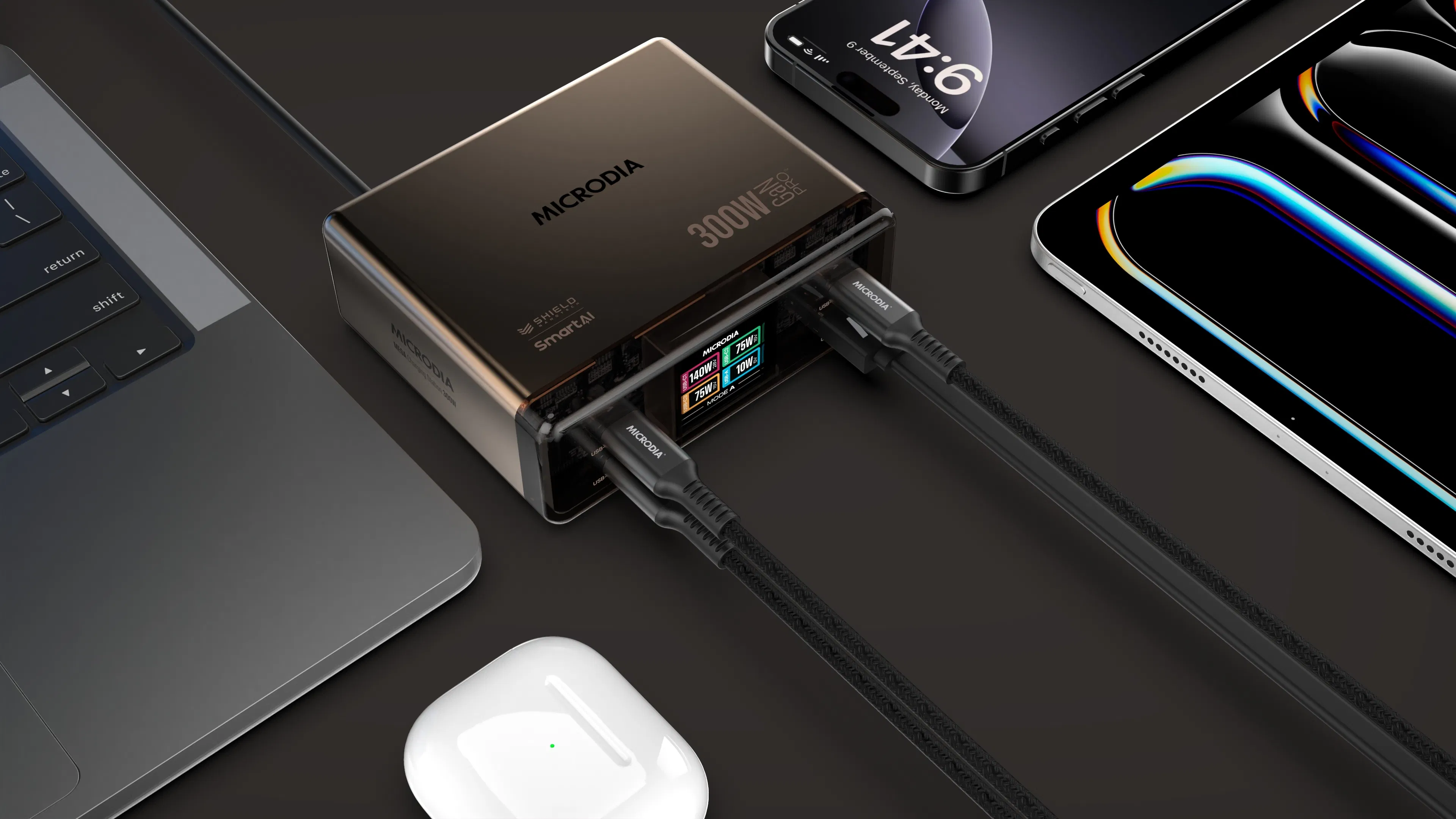総出力300Wにより、この充電器はデバイスが求める高速充電を実現し、一日を通して接続性と生産性を確保します。
