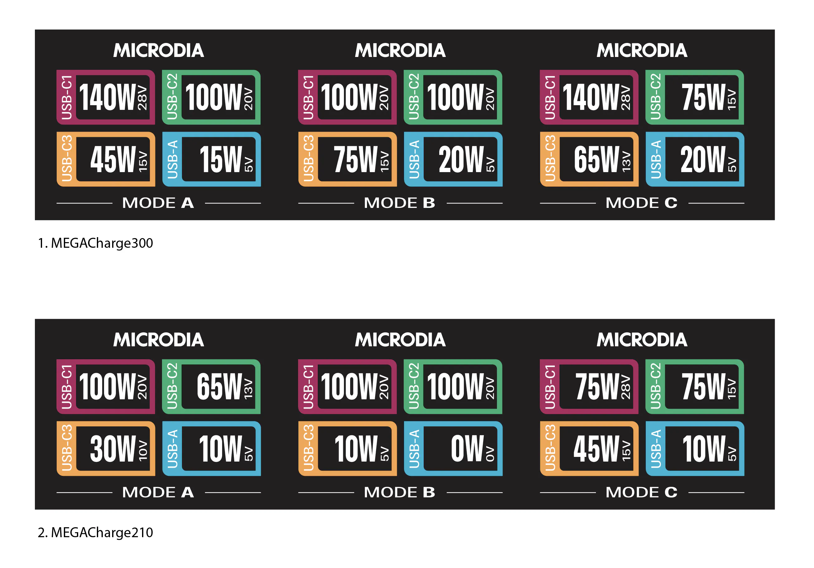 A.各モードは電力分配の仕方が異なります。- MODE A:4つのポートをフルに使用するためのモード(300Wモデルなら最大300W、210Wモデルなら最大210W)。