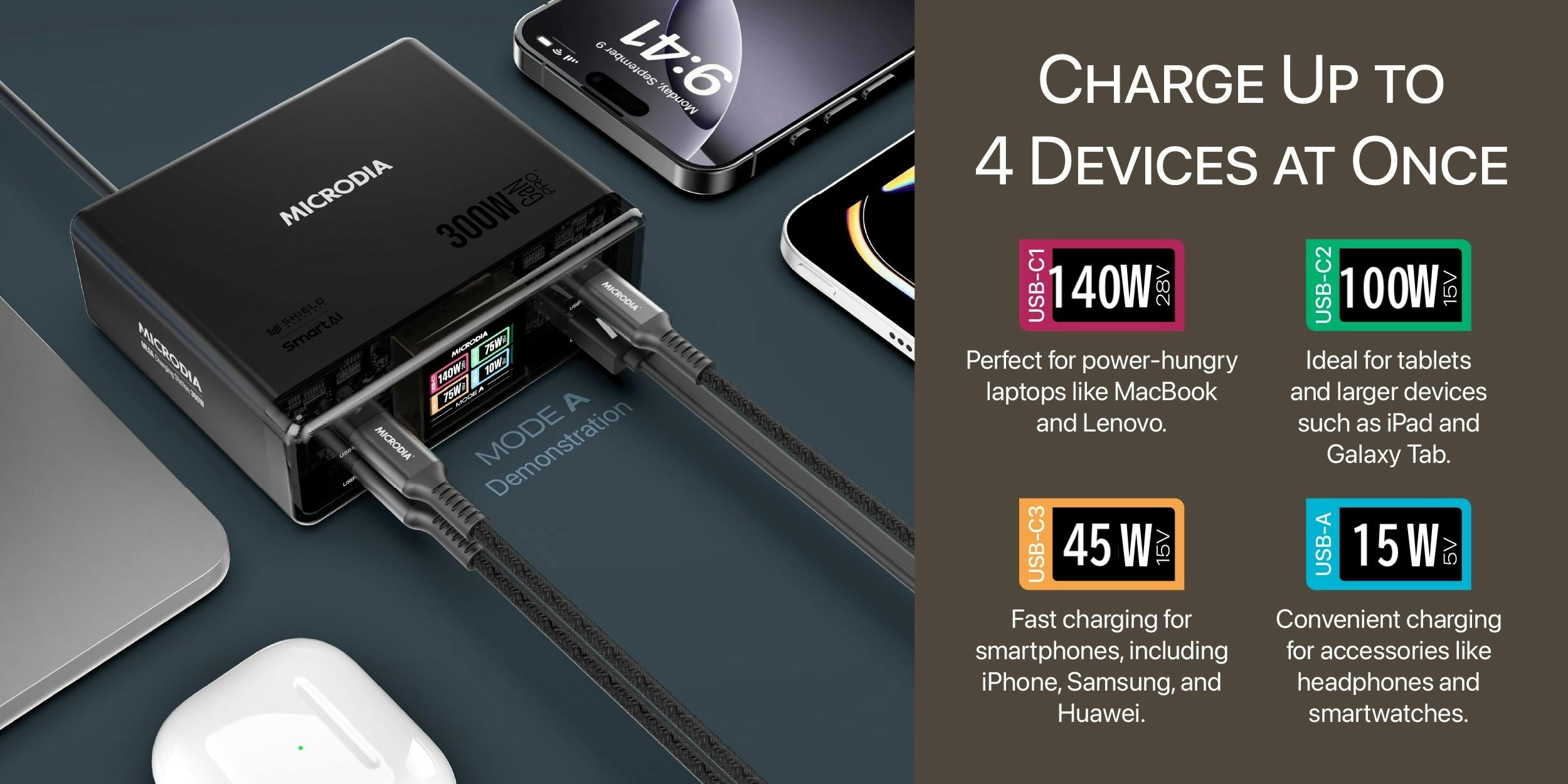 最大300Wで、4台のデバイスを同時に効率的に充電。