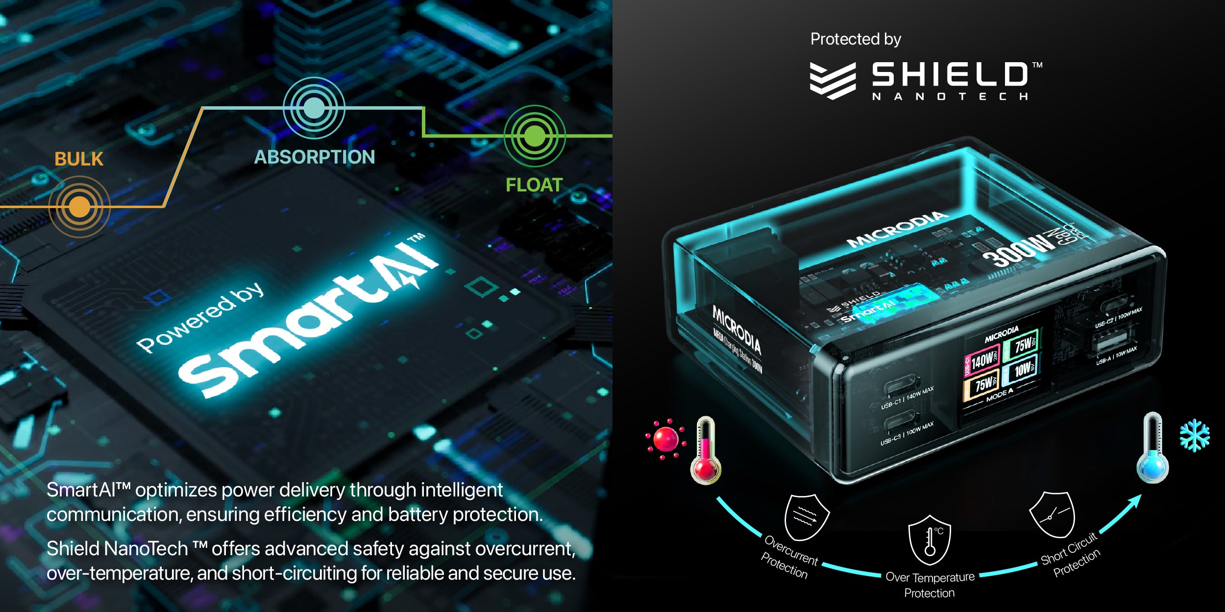 SHIELD NanoTech特許技術:MICRODIA独自のShield NanoTechは、充電温度を監視し、接続されたデバイスを保護するために電力を調整することで安全性を高めます。UL 94の最高評価であるV-0難燃性樹脂で作られたハウジングを備えたShield NanoTechは、表面積を増やすことで熱を放散する3Dマルチ回路基板構造も採用しています。また、回路基板とハウジングの閴スペースをシリコンで埋めることで、熱伝導性と放熱性が向上しています。よって、過充電、過熱、過電流、過電圧を防止します。