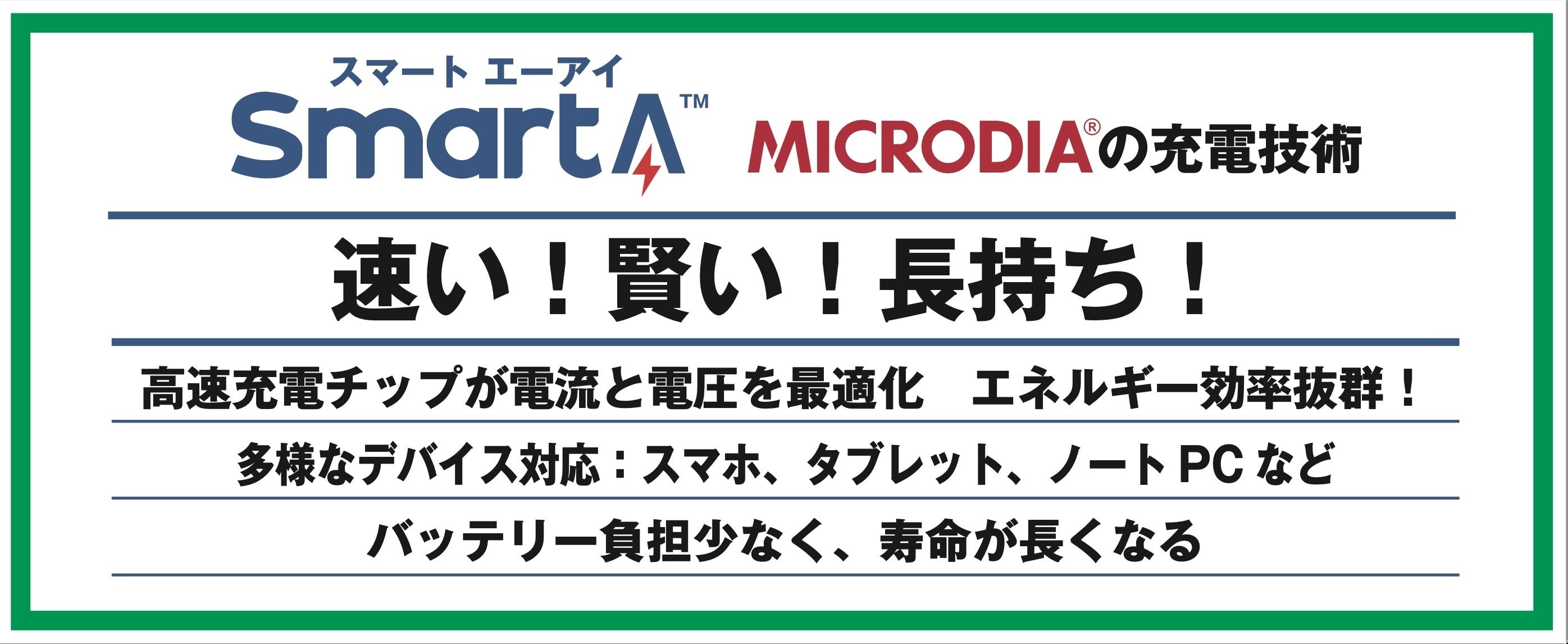 MICRODIA独自の特許技術「SmartAI」:デバイスのバッテリー状態を自動で認識し、最適な出力を提供します。バッテリー残量が増えるにつれて出力電圧と電流を自動調整し、バッテリーの劣化を抑え、寿命を延ばします。