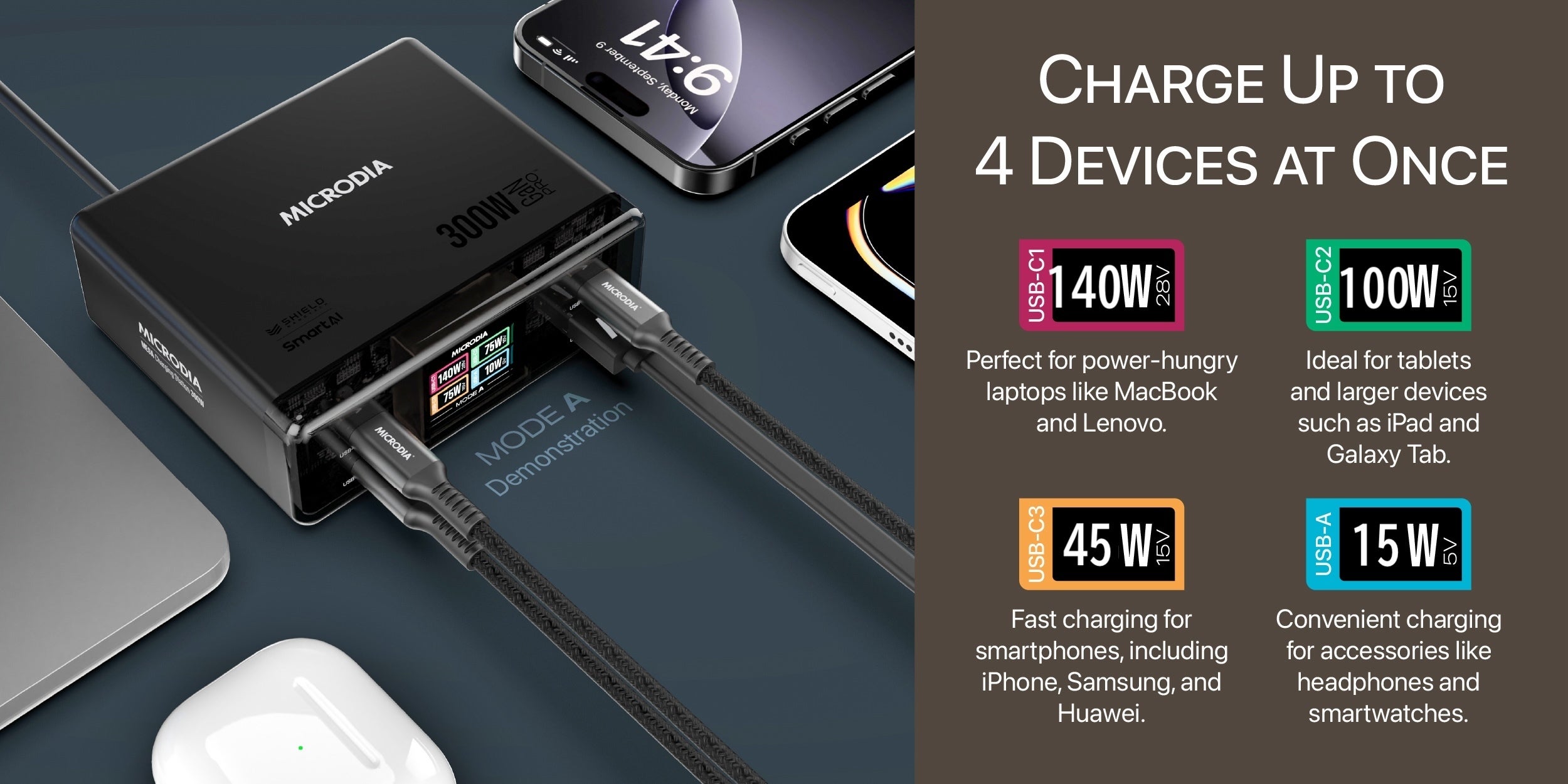 総出力300Wにより、この充電器はデバイスが求める高速充電を実現し、一日を通して接続性と生産性を確保します。