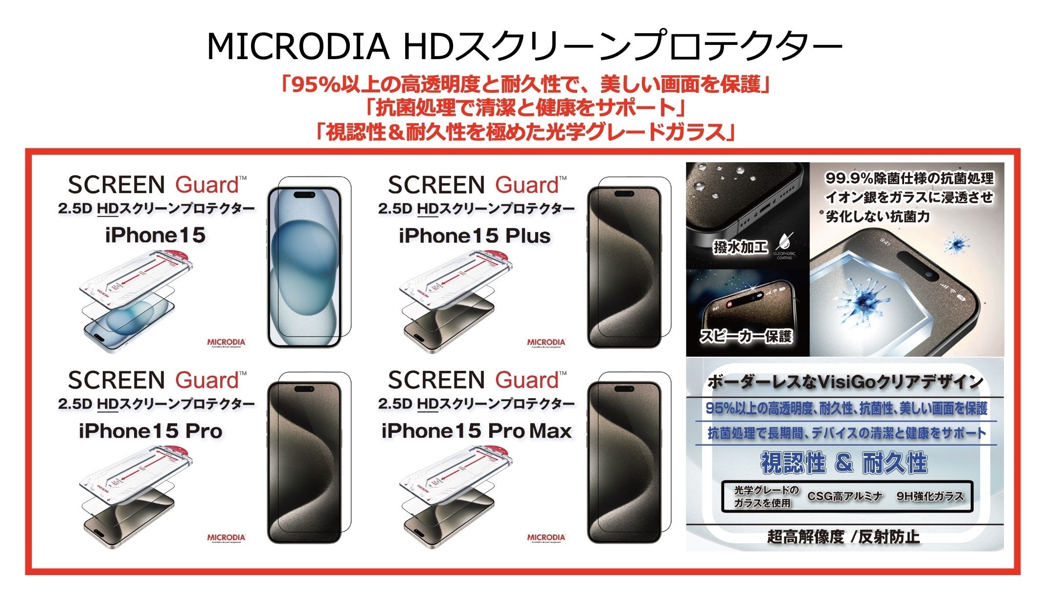 - 商品名:MICRODIA純正品 iPhone15シリーズHDスクリーンプロテクター(2枚入り)