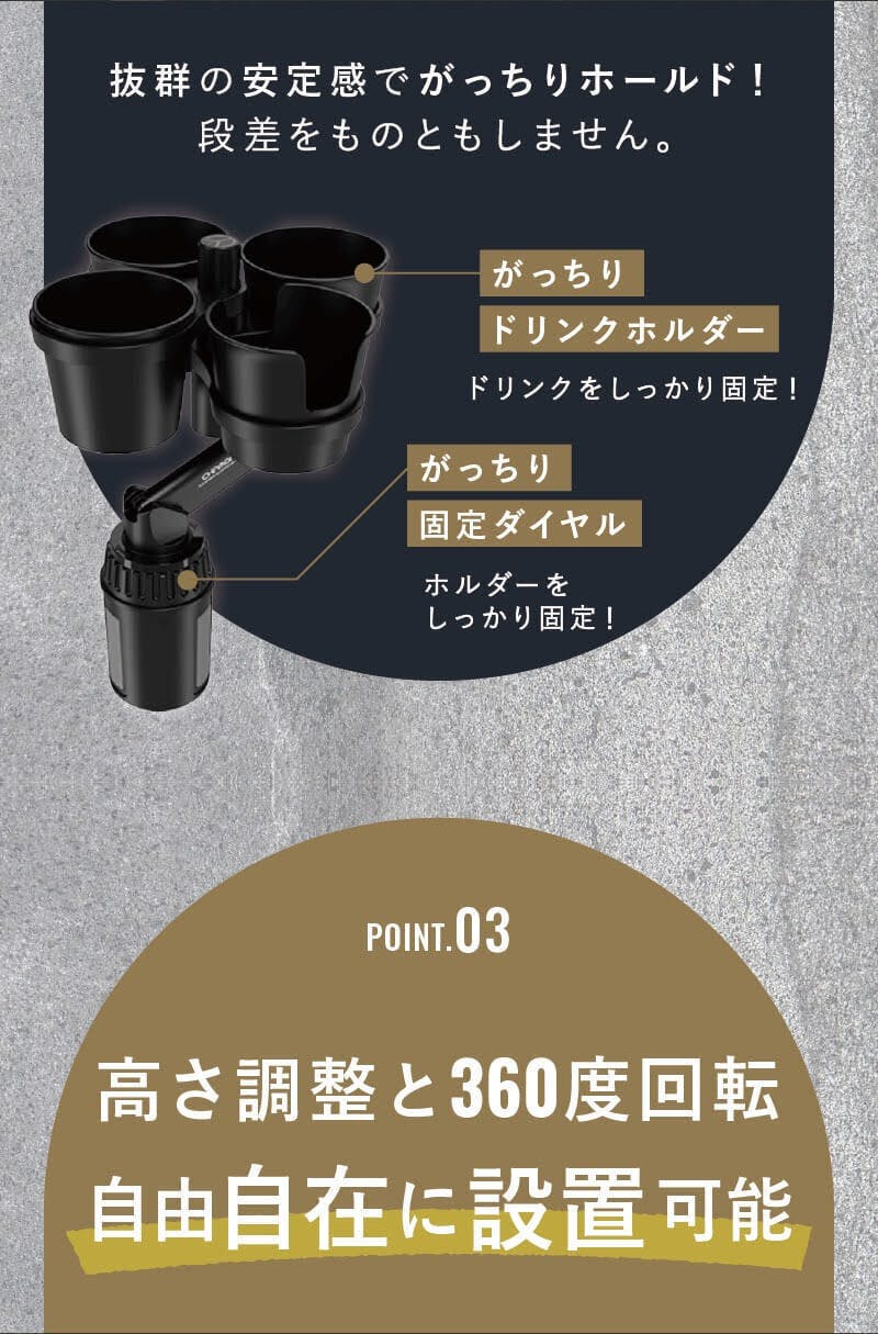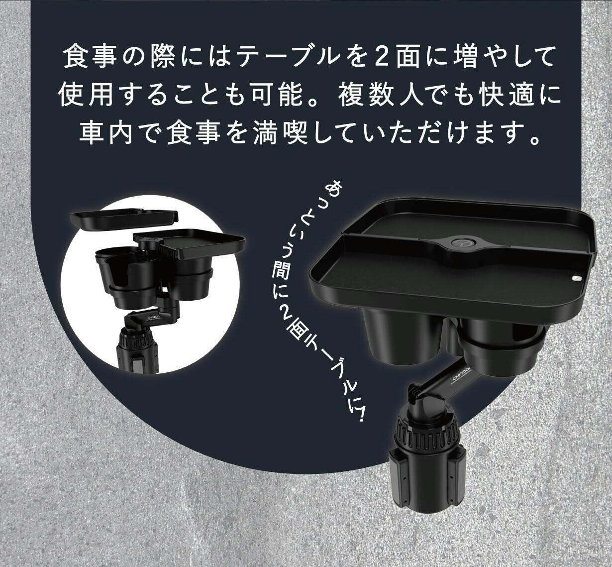 自由自在な取り付け角度、調整可能な関節部、そして便利なテーブルと4連カップ。まさに痒い所に手が届くカップホルダーだと思います。
