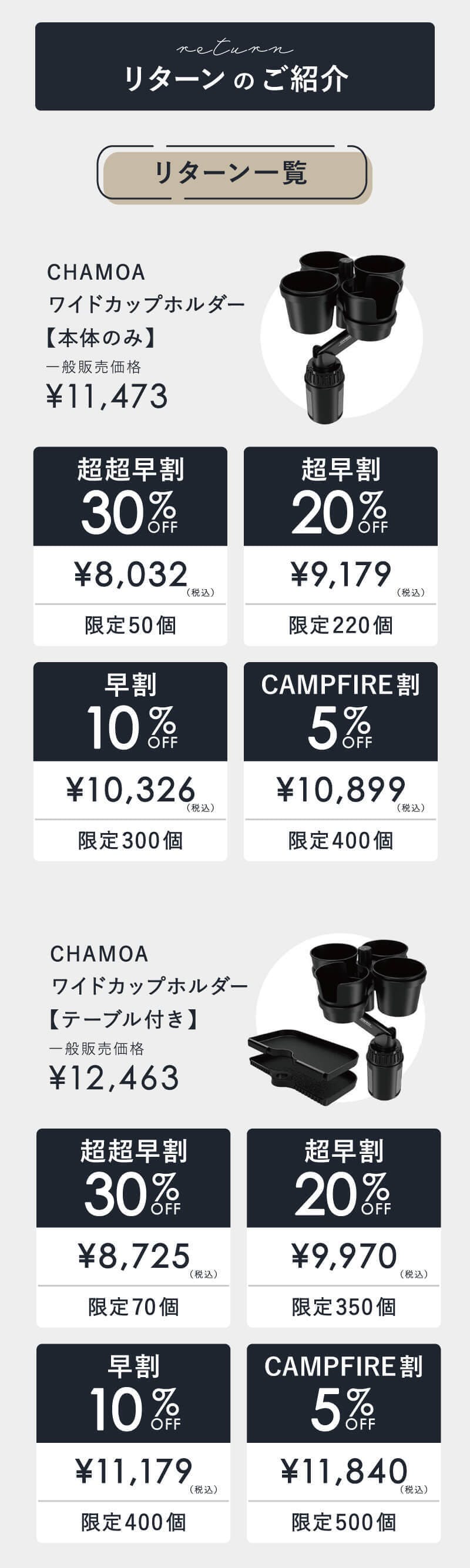 この度、正規輸入販売代理店として、「CHAMOA WIDE ALL-IN-ONE CUP HOLDER VOL.2」の商品情報をCAMPFIREに掲載させて頂きます。