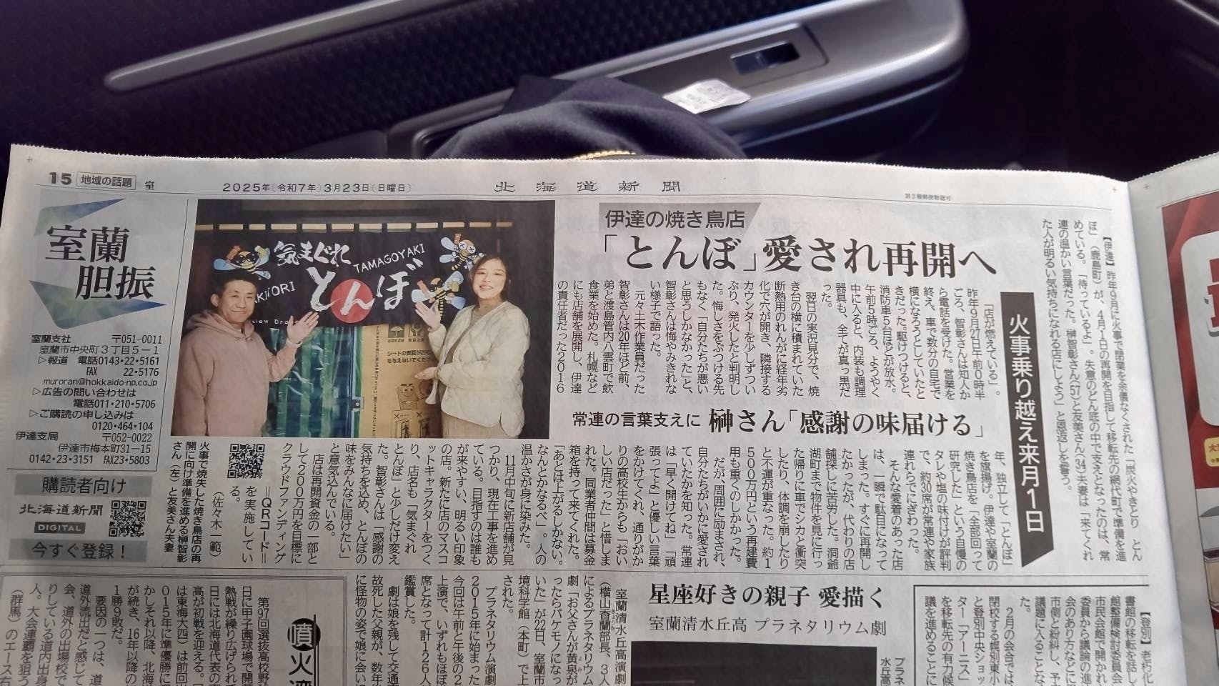 こんにちは。とんぼの店主 榊です。3月23日(日)の北海道新聞<室蘭胆振>に、とんぼの火災から新店舗オープン(予定)に至るまでが掲載されました。見ていただいた方はいるでしょうか?こんなに大きく取り上げていただき、本当に感謝しかありません。日々のご支援も本当にありがとうございます。引き続き、応援よろしくお願いいたします。𖤣𖥧𖥣𖡡𖥧𖤣𖤣𖥧𖥣𖡡𖥧𖤣𖤣𖥧𖥣𖡡𖥧𖤣▶︎ 2025年4月「気まぐれ とんぼ」を移転オープン!火事で全焼からの再建に挑戦!このプロジェクト期間は、2025年5月25日(日)まで。下記の【シェアしてプロジェクトをもっと応援!】では、Xでの投稿、Facebookでのシェア、LINEへの送信が簡単にできます。上記のURLをコピーして、お送りいただいてもOK!シェア・拡散が『 気まぐれ とんぼ 』再建のための力になります。どうぞよろしくお願いします。気まぐれ とんぼ榊 智彰