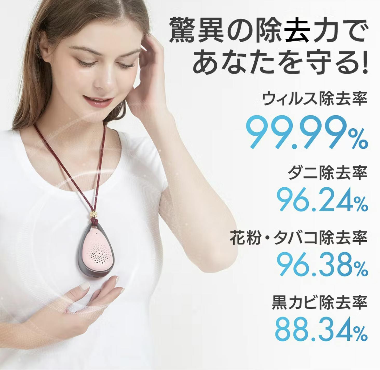 ウィルスや花粉、その他の浮遊物を除去し、いつでも、どこでも新鮮な空気で深呼吸できます!