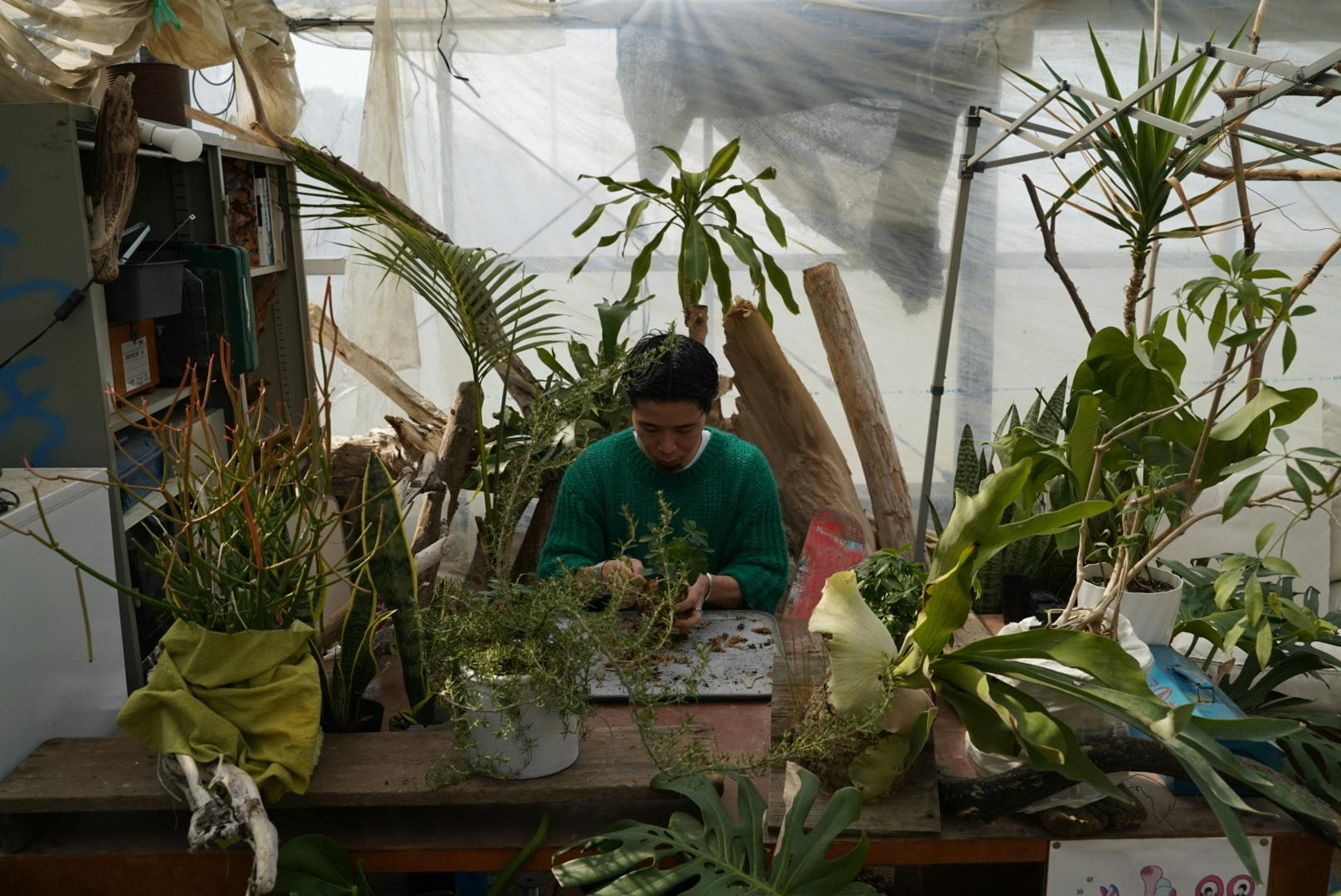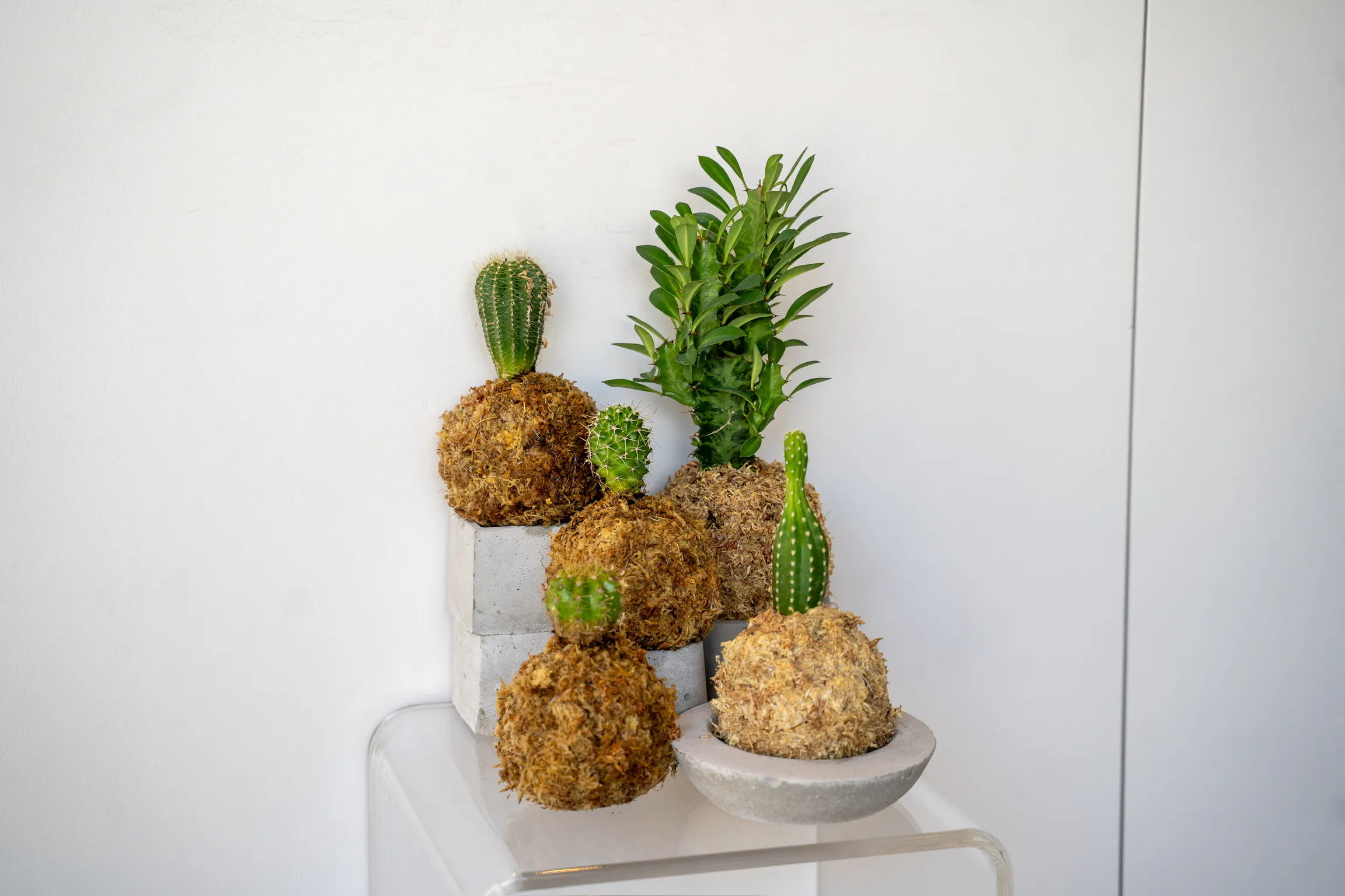 糸島にある温室ハウスで種、苗から育てた植物を苔玉などに加工しています。鉢も温室ハウスで1から作っており、苔玉をもっと身近に感じてもらうためにワークショップなども行っています。