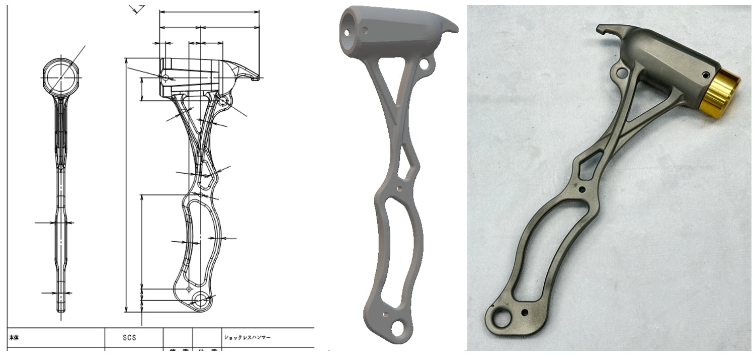 今回のペグハンマーの最大の特徴である、ショックレス性能については、プロジェクトページの説明をお読みいただければおわかりになりますが、打刻ヘッド内部に粒状の素材を入れ、打刻時の作用・反作用によって衝撃を吸収しています。