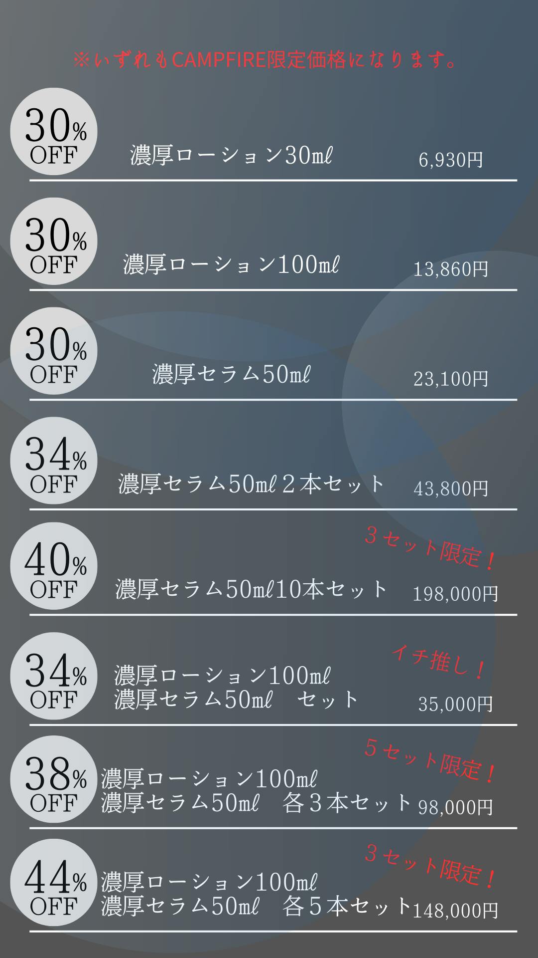 2025/03/01 16:51いつもお世話になっております。実はこの度、プロジェクト開始から2週間たたずして3枠完売してしまっていた「濃厚セラム(美容液)10本セット」のリターンが復活しました!国産ヒト幹細胞培養液を46%という超高濃度で配合していて、RenReNの代表作とも言える濃厚セラムを大容量でおトクにご使用いただけるリターンとなっております。プロジェクトの前半時点ですでに完売していたためなんとか復活させられないかと考えていました。商品生産等の関係で発送時期だけ遅れてしまうのですが、再び3枠ご用意することができました。間に合うことができてよかったです・・・。また、PRTimesさんにてプレスリリースも配信。本プロジェクトのラストスパートを始めています。化粧品を超えた化粧品『RenReN』を最大44%OFFのCAMPFIRE限定価格でお買い求めいただけるのも、残りわずかとなりました。プロジェクトは残り約1週間。3月9日をもって終了いたします。現在私たちは、ネクストゴールの「支援者数46人」に向けて走り続けています。本当に質のいい化粧品を使ってみてほしい。自分自身の肌の力、可能性に気づいて欲しい。そんな思いから、金額や売上ではなく「1人でも多くに届けられるように」という目標を立てさせていただきました。ネクストゴール達成までは残り13人・・・。いつもご協力誠にありがとうございます。我々も走り切って参りますので、ぜひ最後まで拡散などのご協力よろしくお願いいたします! もっと見る