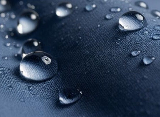 水をはじく状態を「撥水」と呼び、傘生地の撥水性の基準は水をかけた後、水滴の残りや湿り・濡れの程度を5段階で評価します。この撥水評価のほかに一般的に液体と固体表面の接触角が150°を超えると【超撥水】と表現し高度な撥水を意味します。【快適DRY】接触角は152°