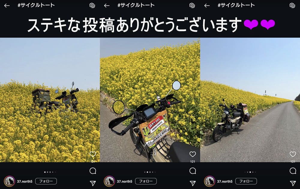 2025/03/27 16:17@37.north5さんの投稿をピックアップさせて頂きます!サイクルトートを菜の花ツーリングのお供に♥ありがとうございます!!そして、よーく見ると 当社の保冷機能付きシートバッグを搭載しているではありませんか!!そこにトートバッグを吊るしてサイズ感もGOOD!!!恐れ入りますーーーまたランドセルが愛らしいですね♥♥♥つい先週、東京でも雪が降っていましたが、季節はすっかり春陽気になりました。ちらほら桜が咲き始め、いよいよお花見シーズンに突入です。サイクルトート支援期間終了まであと4日!!ぜひSNSでのシェアや身近な方にもおすすめしていただけると嬉しいです。https://camp-fire.jp/projects/822224/viewありがとうございました。 もっと見る