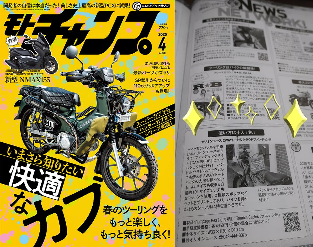 こんにちは!モトチャンプ4月号で【2wayトートプロジェクト】をご紹介いただきました!白黒のちいさな記事ではありますが、発売日にご支援いただいた方もいらっしゃりとても嬉しく思っております。感謝感激!ご支援いただきましたみなさまへトートバッグのお引き渡しは4月と掲載しておりますが、3月下旬頃にお渡しすることができそうです!!確実な日程は現在調整中のため追ってご連絡します。最短日程でお届けできるよう準備を進めております★