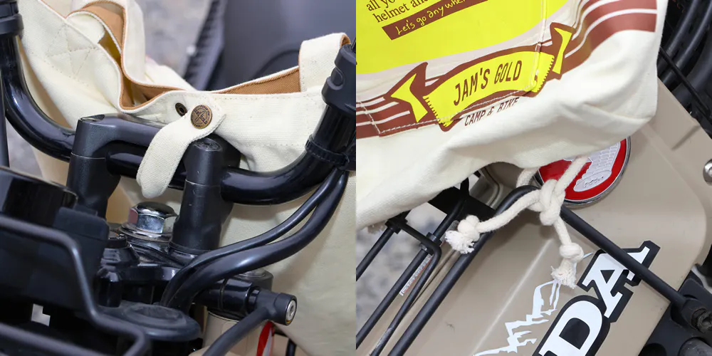 バッグ上部中央のスナップボタンや底面の紐は、車体に取り付けられるところがあると安定します。お好みでご利用ください。