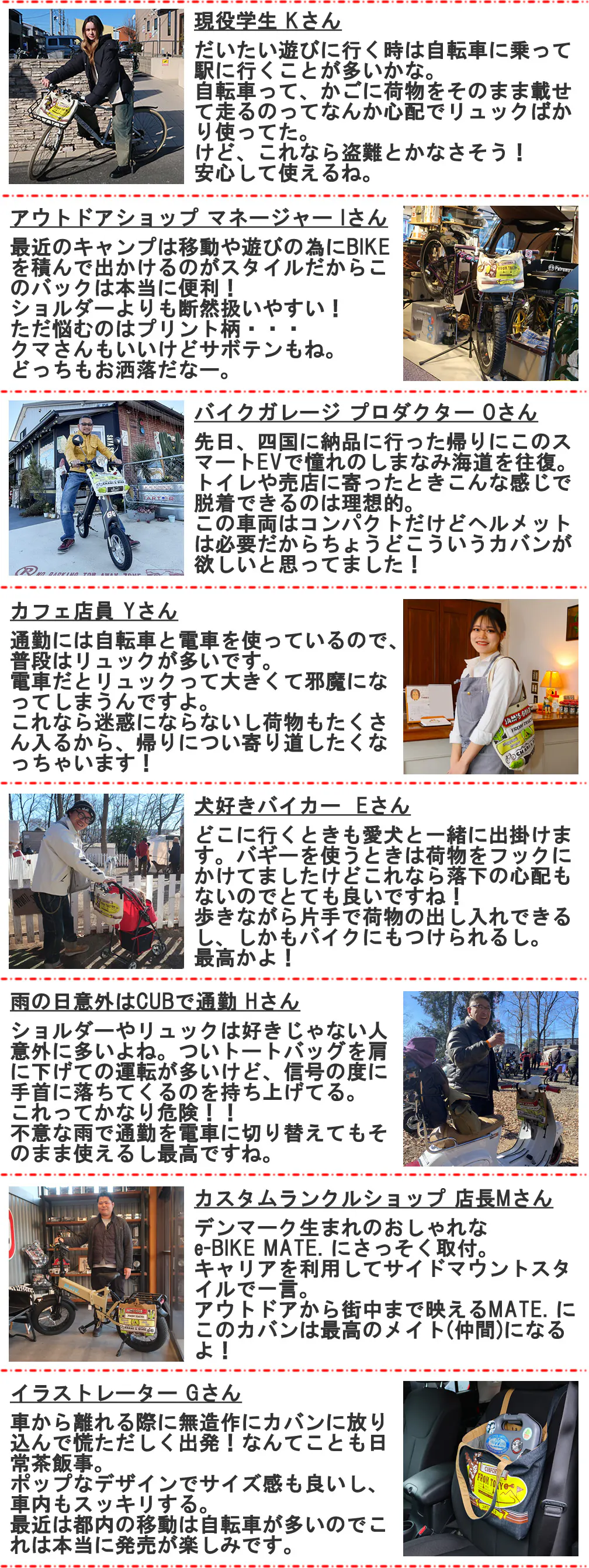 ハンドルにぶら下げて移動する楽さと、乗り物を離れて移動する時の違和感のなさをぜひ多くの方に試して欲しいです。
