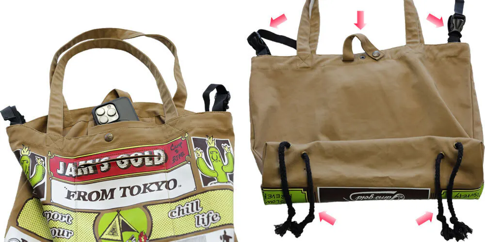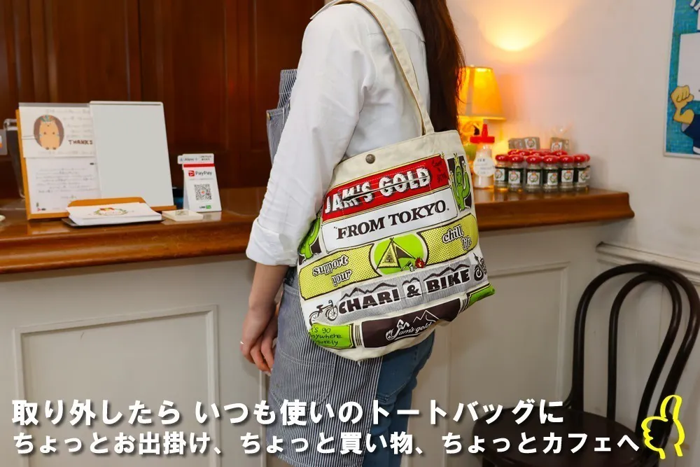 ちょっと駅まで自転車で、そこから電車移動なんてときにはもってこいのトートバッグですね。