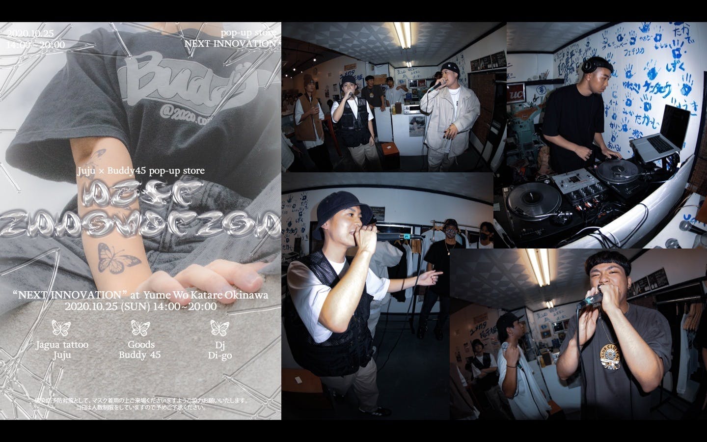 仮説が立ったらすぐに検証――ということで、沖縄にて「Next Innovation」というイベントを2回開催しました。Buddyの物販をはじめ、ジャグアタトゥーのアーティスト、来場者の似顔絵を即興で描くイラストレーター、ラッパー、DJなど、あらゆる表現者によるパフォーマンスを詰め込んだ濃密なイベントとなりました。