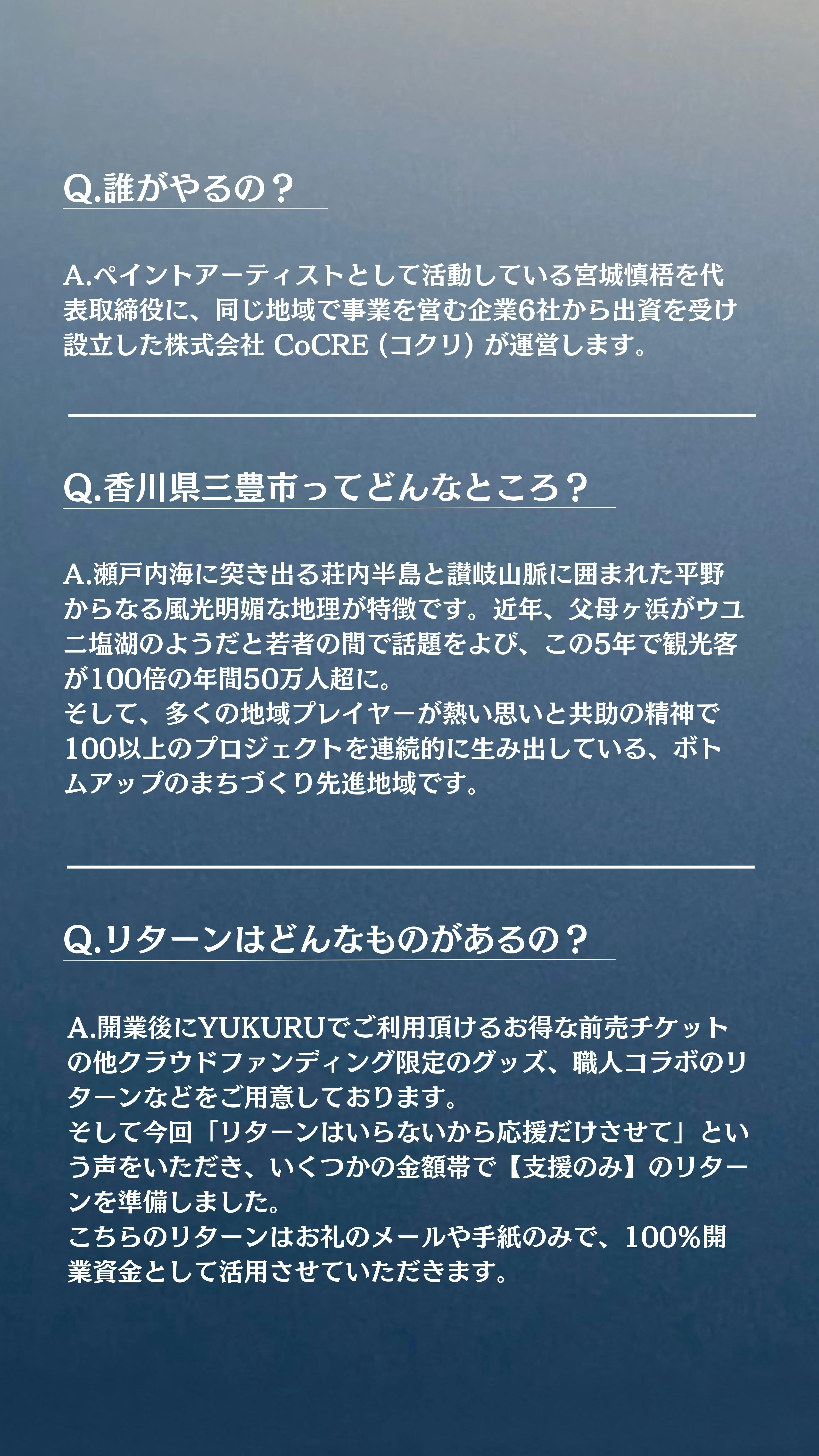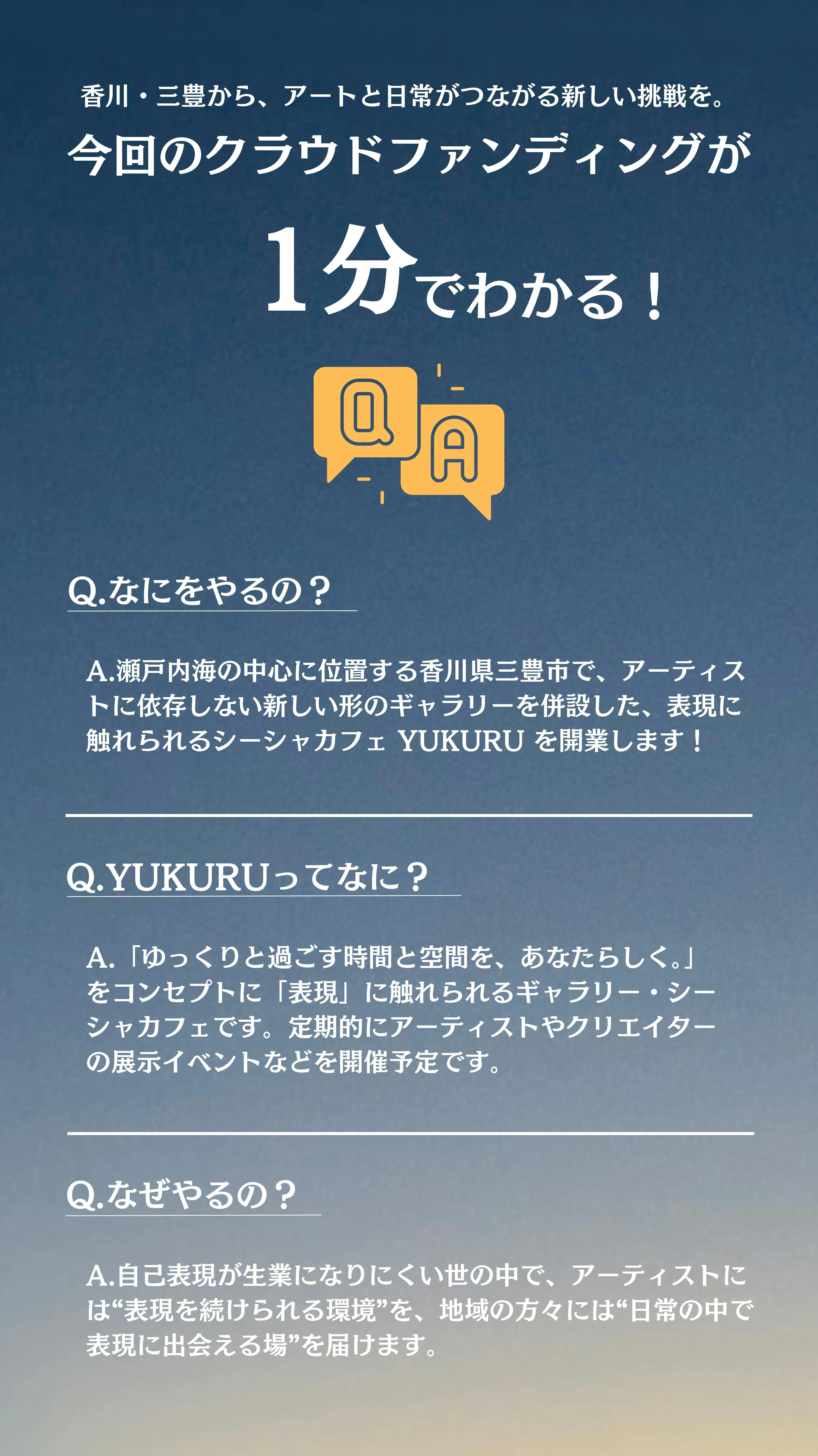 香川県三豊市はSNSで注目され観光客は6年で約100倍に増加、過去5年で100件を超えるプロジェクトが誕生しました。その挑戦の土壌に、アーティストに依存しない新しい形のギャラリーを併設した表現に触れられるシーシャカフェ「YUKURU」を開業します!皆さんと共に育てていけたら嬉しいです。