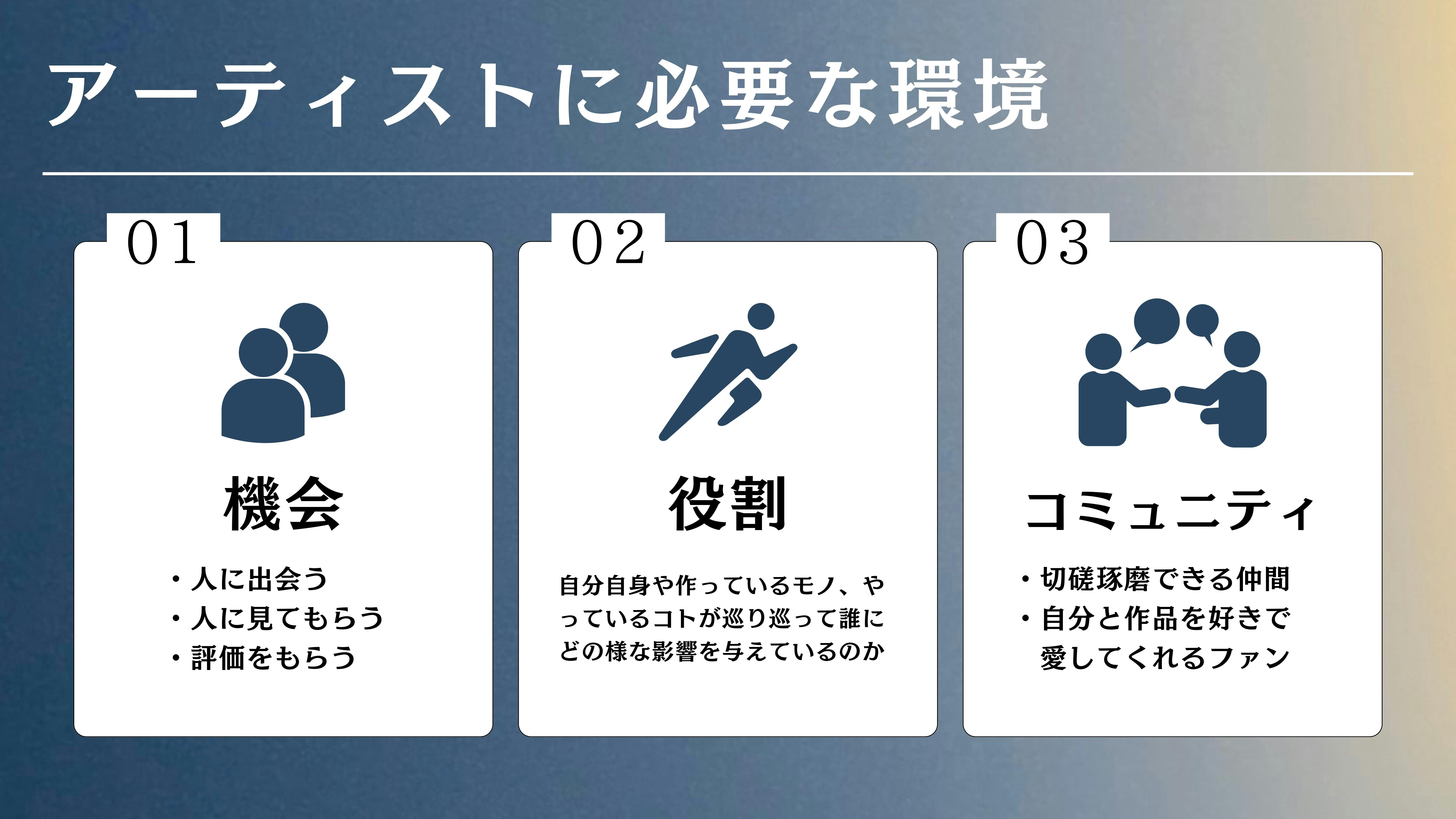 その状況に気づいたとき、僕の中に「大好きな仲間と楽しく一緒に居続けるにはどうすればいいのか?」「どんな環境が必要なのか?」という問いが芽生えました。そこで当時の僕が立てた仮説は、アーティストに必要なのは「機会」「役割」「コミュニティ」である、ということでした。