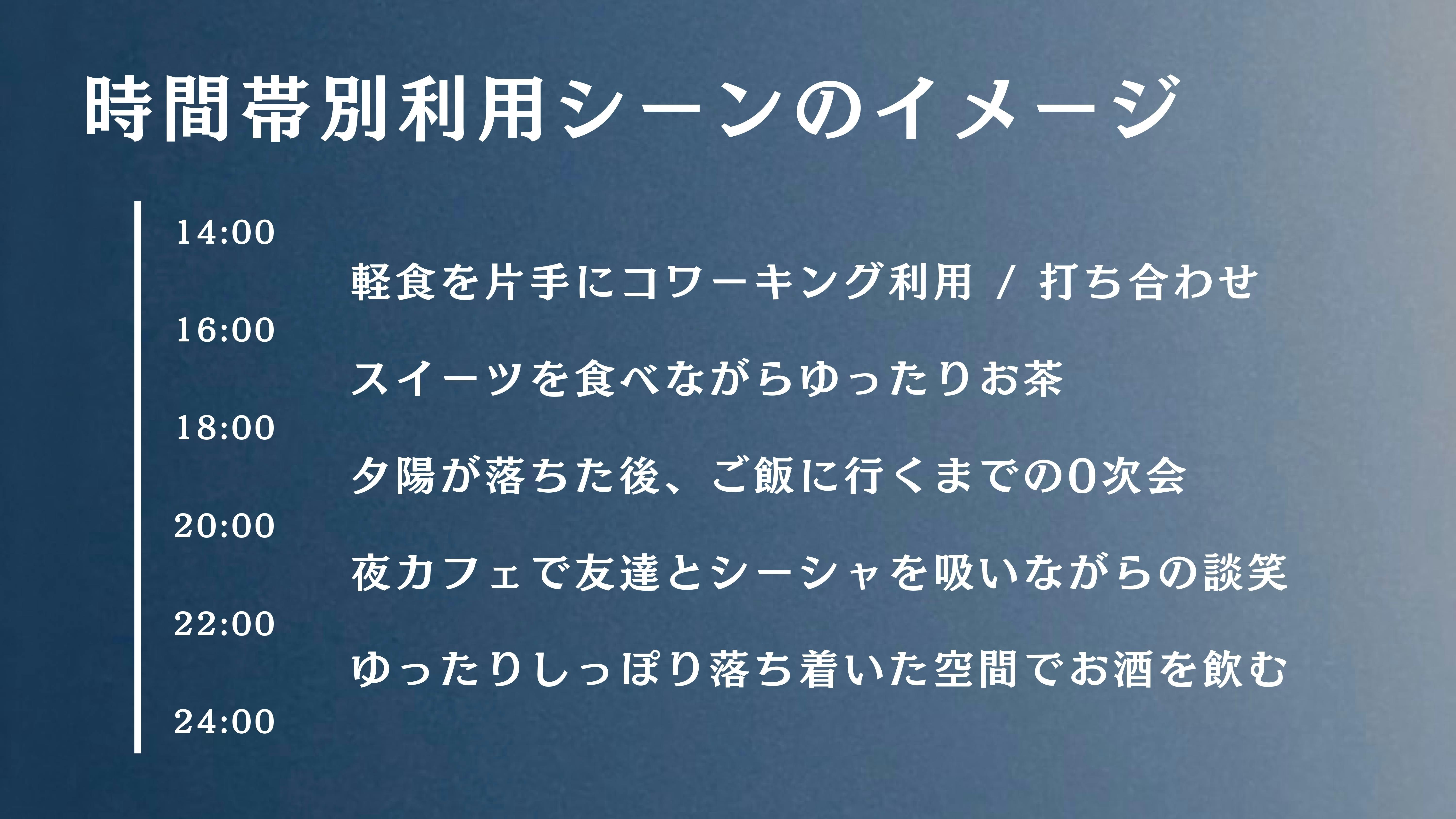 例えば、コワーキングスペースとしてコーヒー片手にPC作業、昼食後のカフェタイムにスイーツを食べながらお友達と談笑、しっぽりと飲みたい夜に一人で。などなどさまざまなシーンでご利用いただけます。