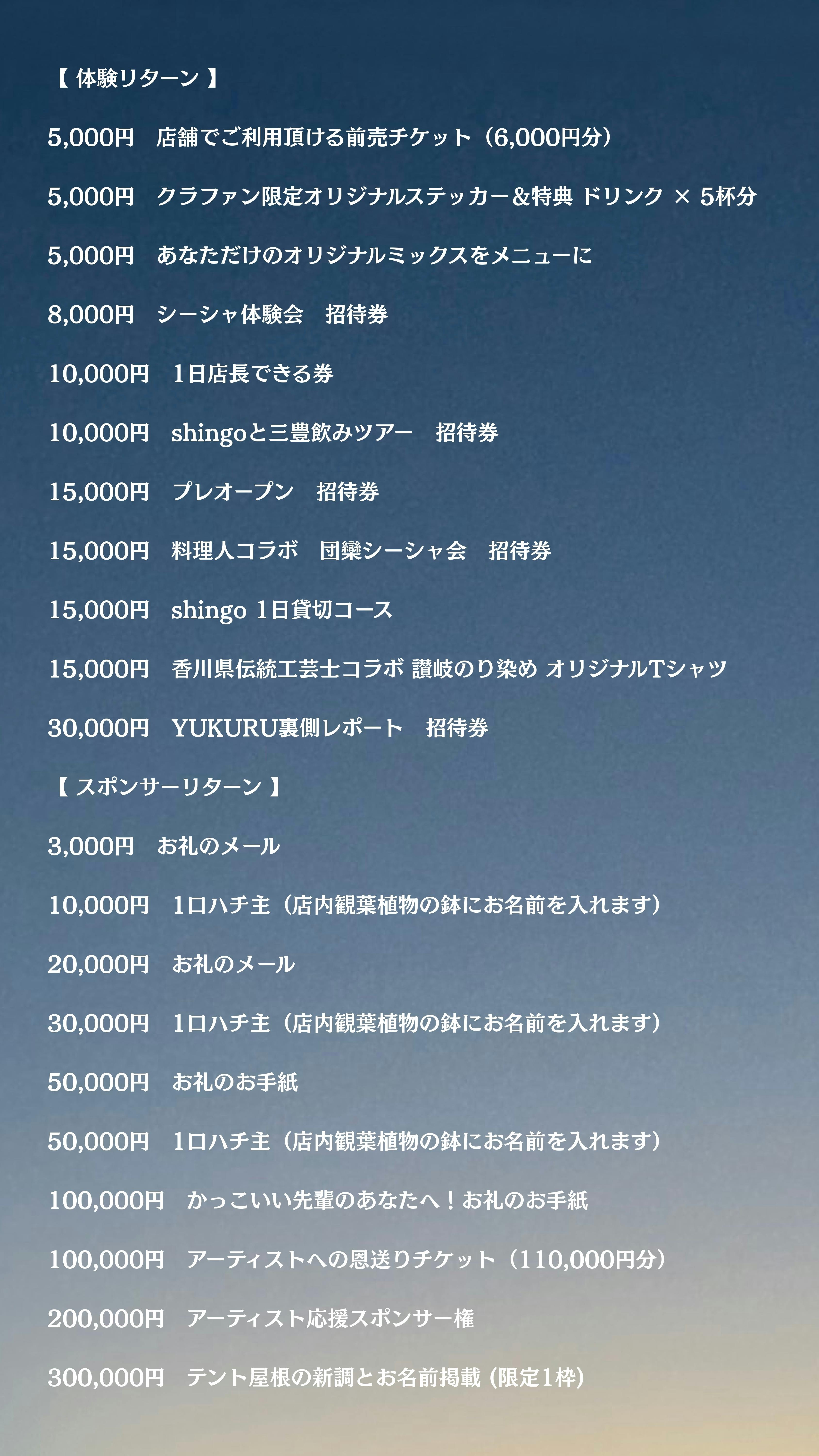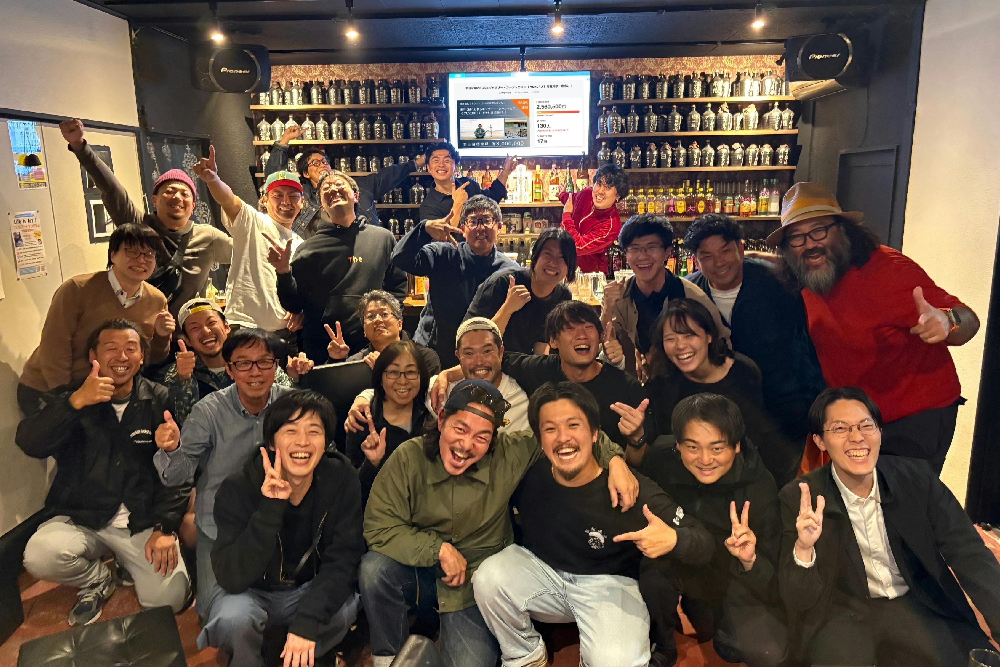 • お世話になっております!活動報告です!11/9の23:59をもちまして、今回のクラウドファンディング終了しました!最後の最後まで仲間たちに囲まれて、終了間際に第五目標の350万円を達成することができました!終わってからも休む間もなく、パタパタしていたら活動報告が遅くなってしまいました!すみません!クラファン終了の前日11/8(土)には三豊鶴をお借りして、MUJINZOU(NIGHT)CLUBを開催しました。85名のお客様にご来場いただき、飲食ブースは完売が続出したり、ライブステージでは涙する人が出るほど(一番泣いていたのは僕です笑)、イベントは大盛況で幕を閉じました!今回のクラファン・イベントを通して、たくさんの物語と気づきを得ることができました。書きたいことがたくさんありますが、詳細はラジオで自分の言葉で話していきますのでチェックしてもらえると嬉しいです!「YUKURU RADIO」はこちら。https://open.spotify.com/show/4rpD53ipWFw50p9qWSHVC2?si=165d306cd6f44493リターンの開始やプロジェクトの進捗などは活動報告に書いていきますので、引き続きよろしくお願いします!改めてご支援いただいた皆さん、本当にありがとうございました!勝負はここから! もっと見る