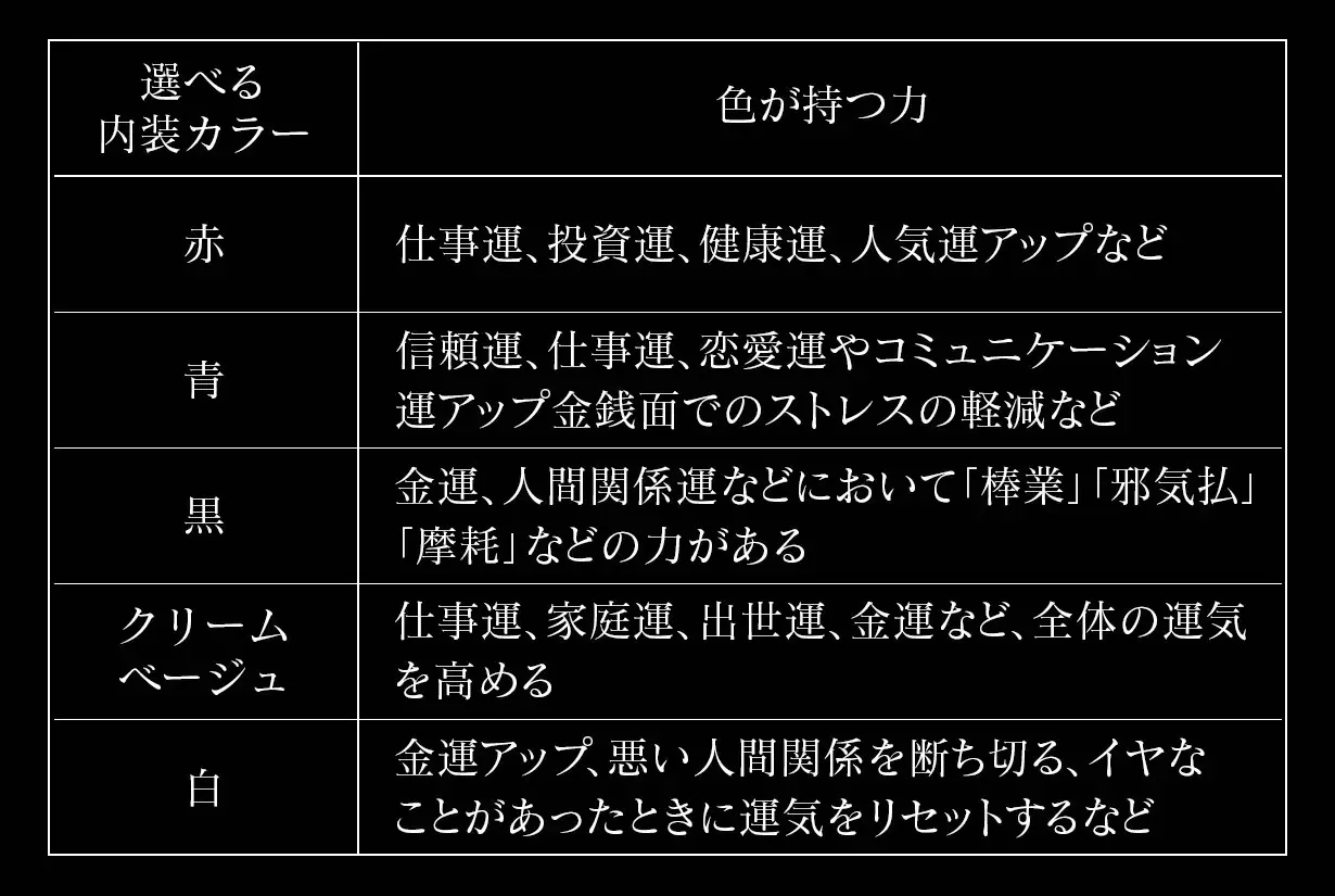 この5色には、それぞれ開運へと導いてくれる力を持つカラーをラインナップ。