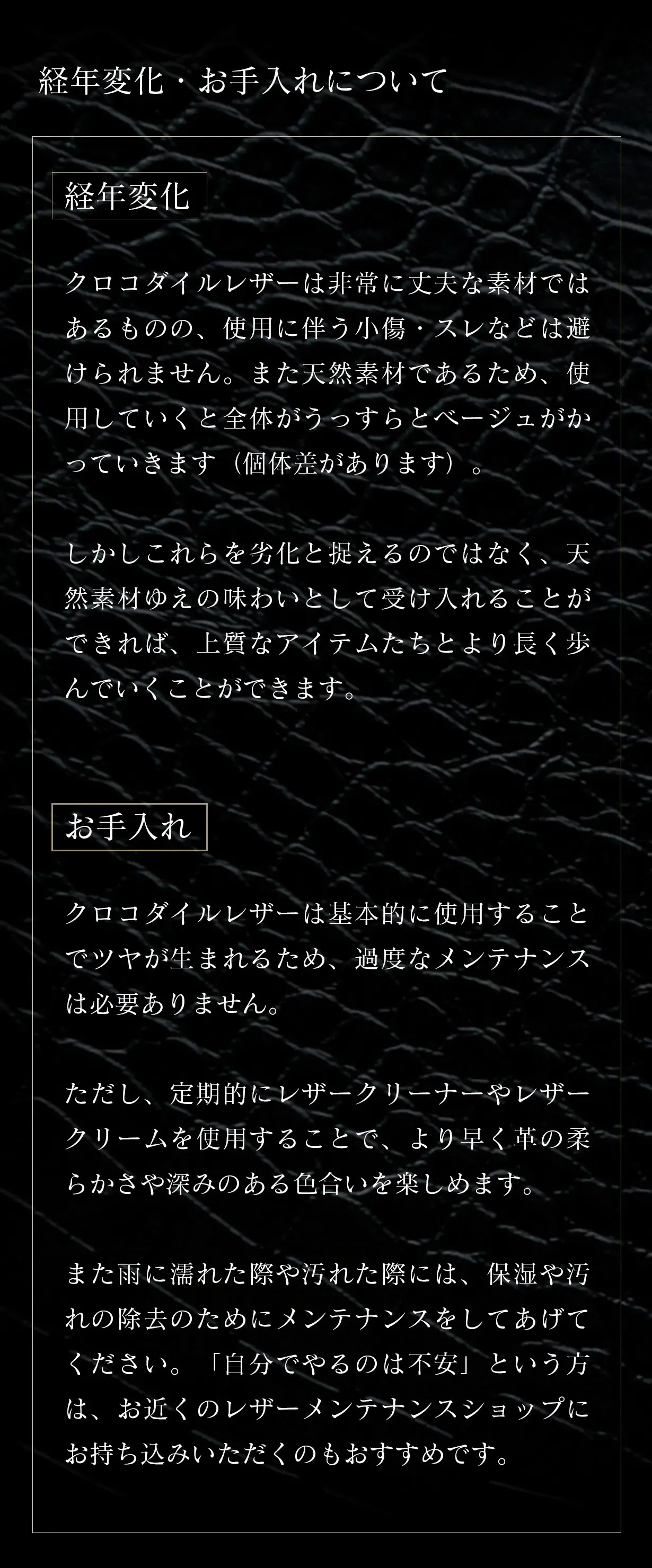 今回はワニ革の本場・タイで丁寧に育てられ、加工されたハイクオリティなヒマラヤクロコを贅沢に使用しました。