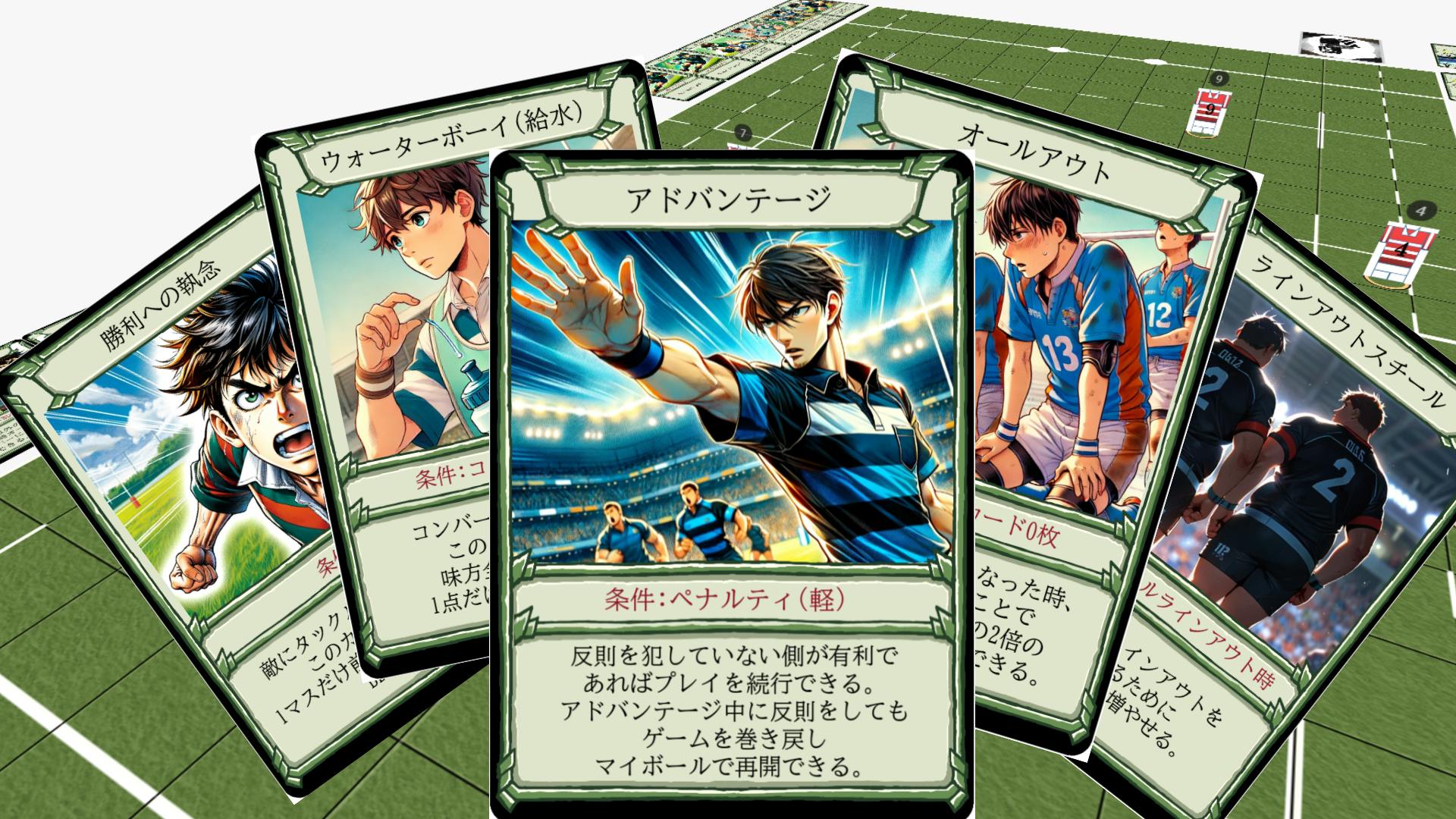 サポートカードには、能力値にボーナスを与えるものばかりではなく、アドバンテージで軽微な反則を無視したり、選手のスタミナや手札のサポートカードの回復、タックルされても1マスだけゲインできるような気合や根性のカードなど、いろいろな種類のカードがあります。