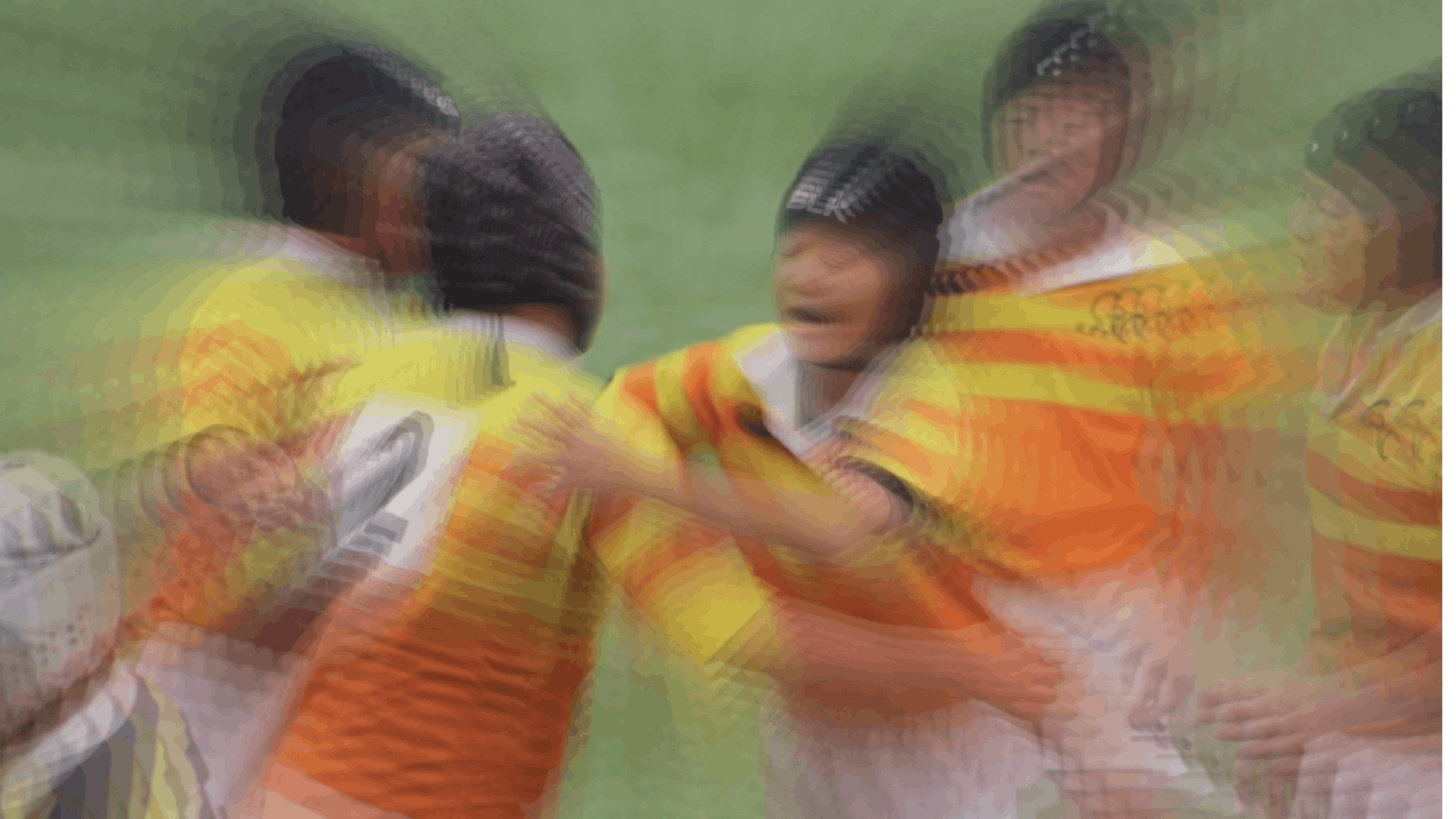 迫り来るディフェンスの【POW】によるタックルに対して、ボールキャリーは…