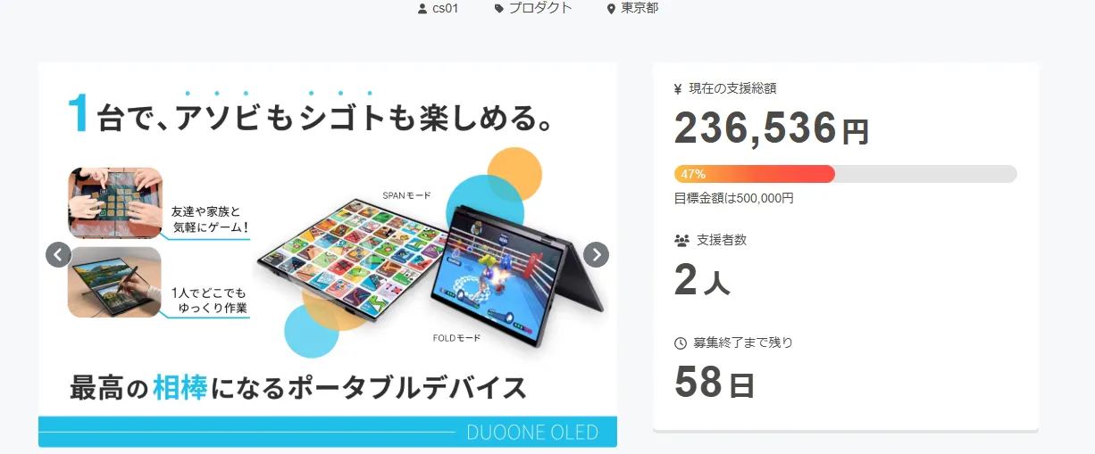 2025/06/03 19:30皆さまの温かいご支援により、公開初日で目標達成率47%を突破しました!本当にありがとうございます。現在、数量限定の「10%OFFクーポン」を配布中です!10%OFFクーポンをゲットこのクーポンは先着順・期間限定となっておりますので、ぜひお早めにご利用ください。ゲーミングにも仕事にも使える折りたたみ式の高性能モニターです。マルチデバイス対応・持ち運び可能で、外出先でも快適な作業環境を実現します。いいね!してくださった皆さま、ぜひこの機会にご支援ください!10%クーポンは数に限りがあるため、迷っている間に終了してしまう可能性があります。お得な今のうちに、ぜひお早めにご購入を! もっと見る
