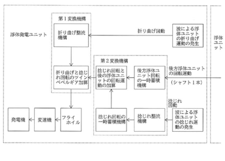 本波力発電システムの屈曲動揺平面型は、浮体ユニットが波力により、揺れ動くときに浮体ユニット間で生じる「曲がり」や「捻じれ」により発電させる。