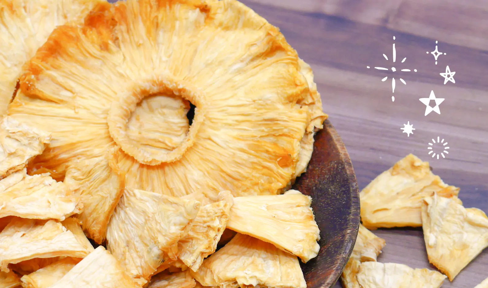 皮を丸ごとむき、芯を取り除いてスライスしたものを、60~70度の熱風で乾燥させた完全無添加のドライパイナップルです。