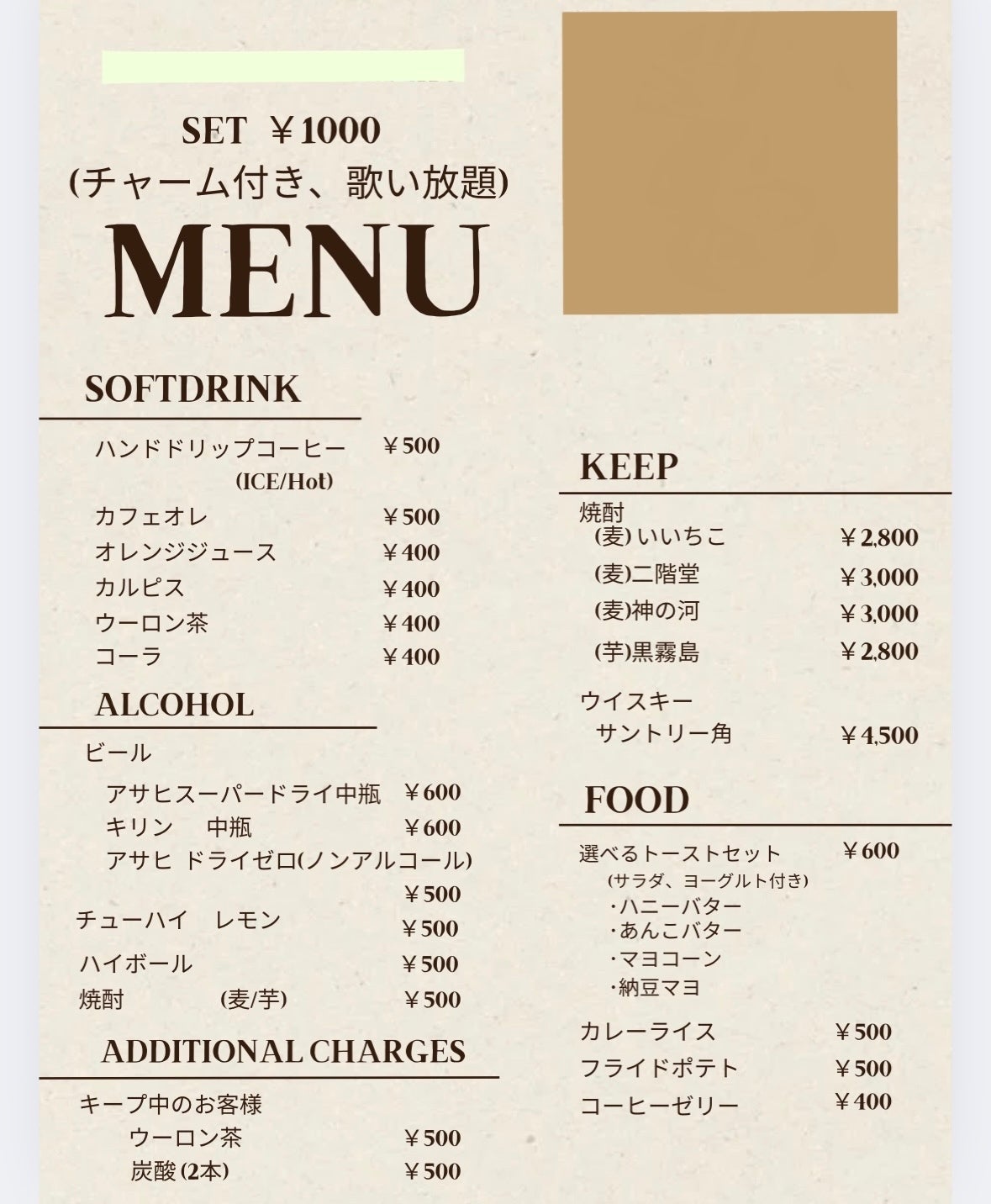 カラオケ歌う方は(ワンドリンク+チャーム+歌い放題)で1000円です。