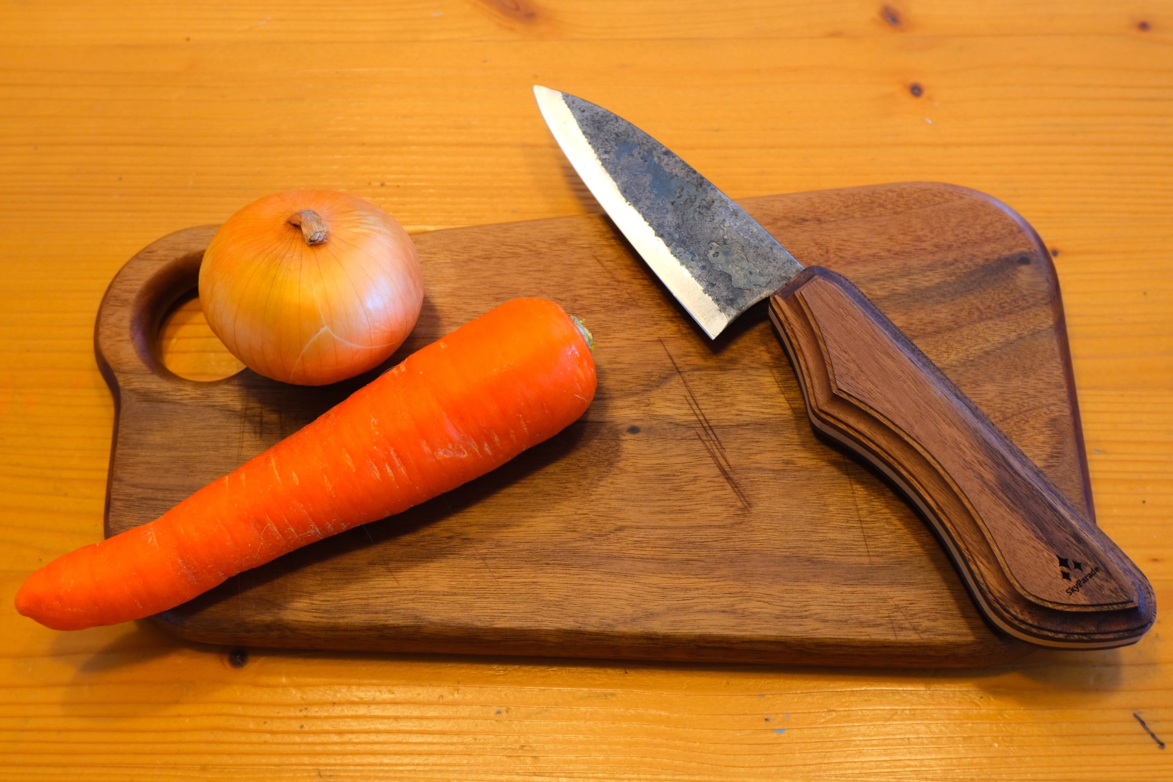 キャンプでは小さなまな板やカッティングボードを使いますが、普通の包丁では大き過ぎる。アウトドアナイフで食べ物を切りたくない方もおられます。食材を切るのに適した小さい包丁はなかなかカッコいいものが売っていない。