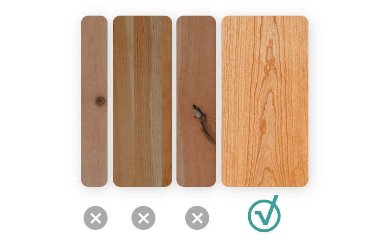 高品質のチェリー材産地として有名な、アメリカペンシルベニア州の木材を、手作業で選別しています。ステップ1:欠陥品を除去ステップ2:色差がある木材を除去ステップ3:色差や色ムラの多い木材を除去最後には、木目の美しい木材のみが残ります。