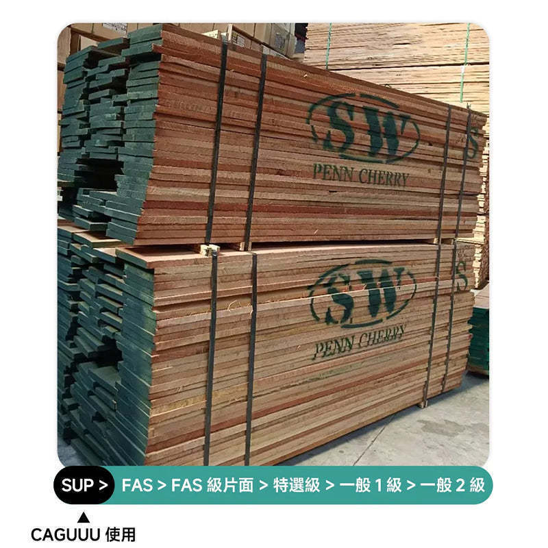 全米広葉樹製材協会(NHLA)は製材工程で木材を格付けしており、FAS級>FAS級片面>特選級>一般1級>一般2級の等級を決定しています。CAGUUUは米国木材サプライヤー「SW」が厳選したSUP級のチェリー材を採用しており、FAS級よりもさらに品質が高いです。