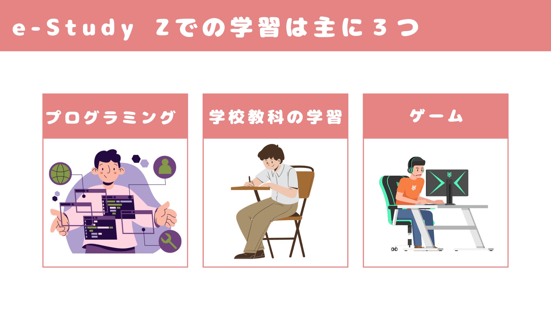 e-Study Zでは、現在小中学校で、必修化されているプログラミング学習に加え、それぞれのニーズに応えた学校教科の学習を行っています。