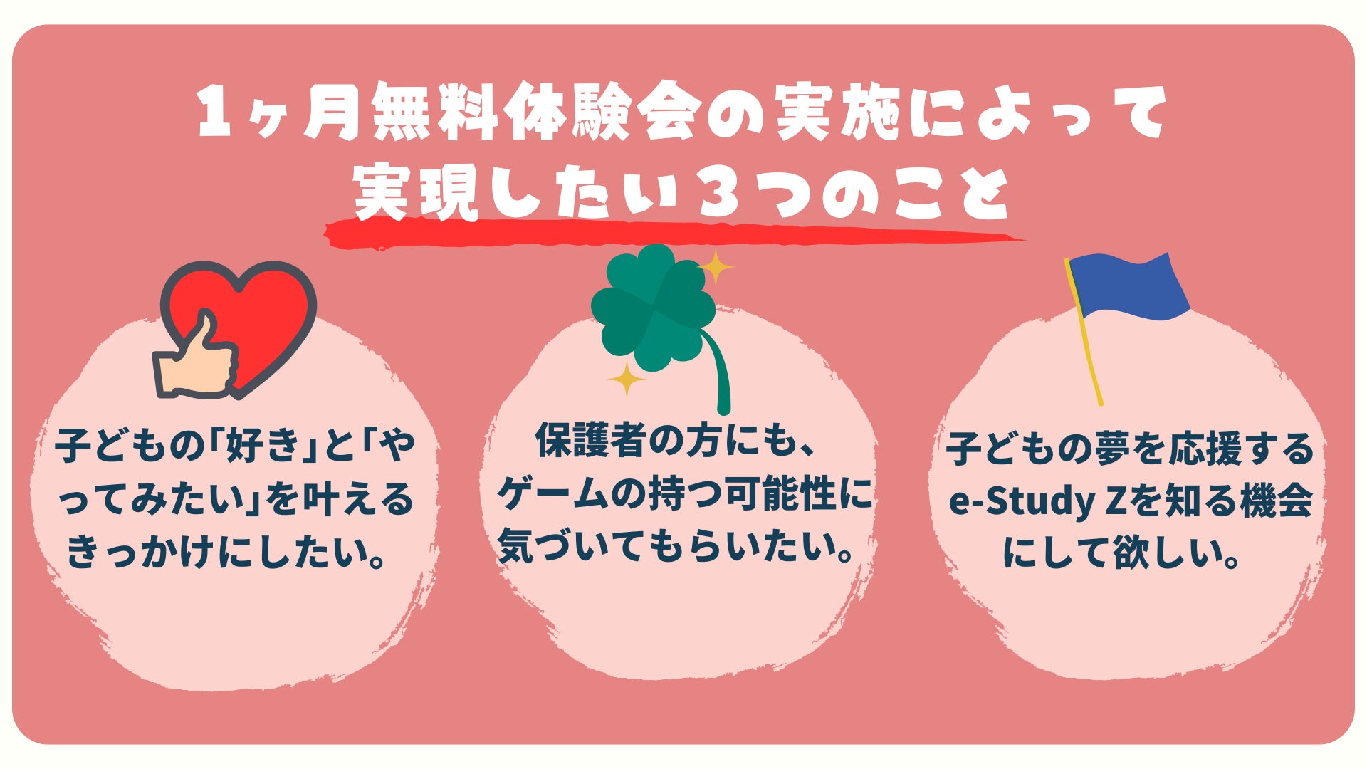 しかし、そうした可能性に触れる機会が少なく、「ゲーム=遊び」だけと思われがちです。そこで、1か月の無料体験を通じて、ゲームから得る学びを実際に体験できる場を提供したいと考えました。