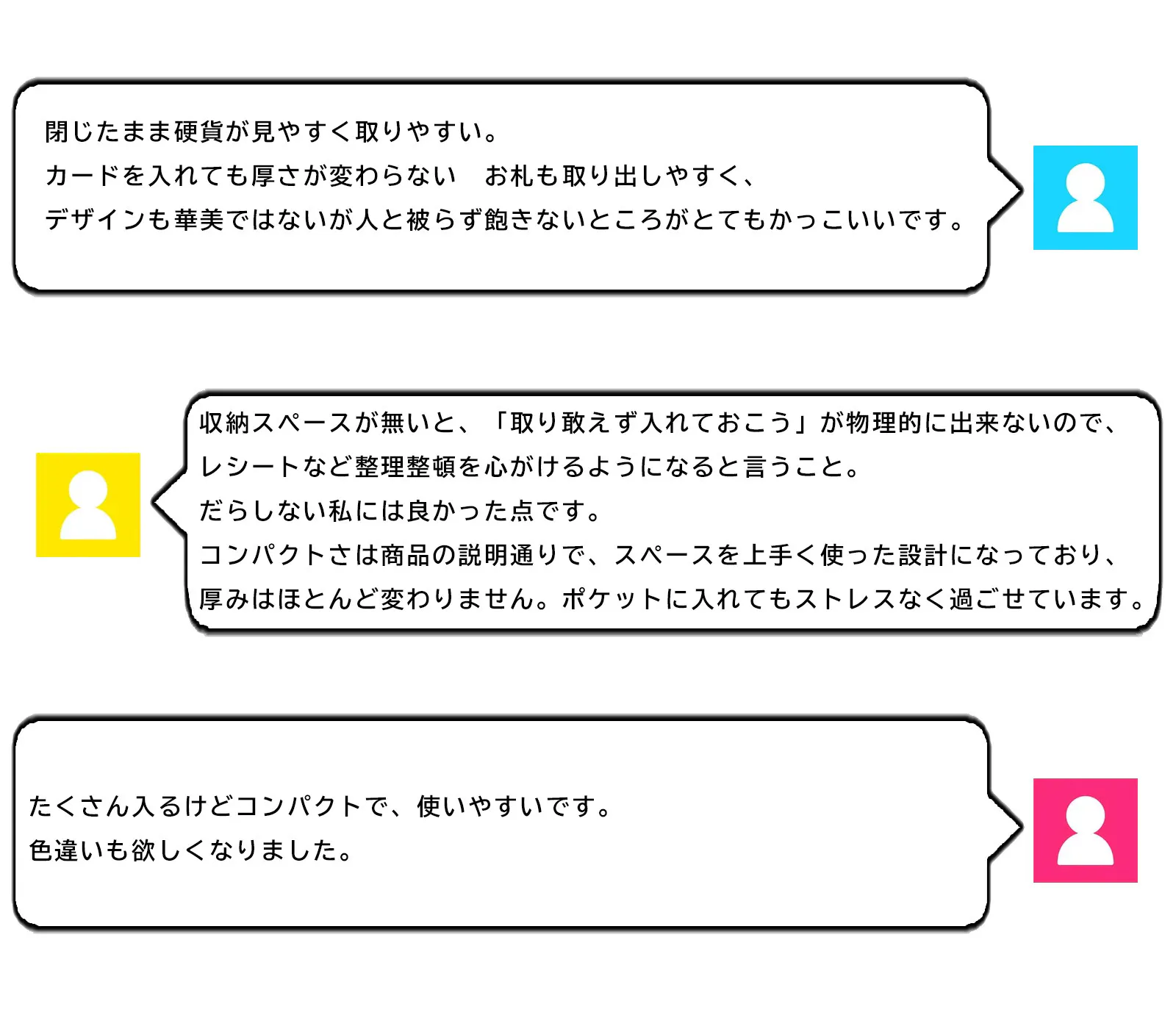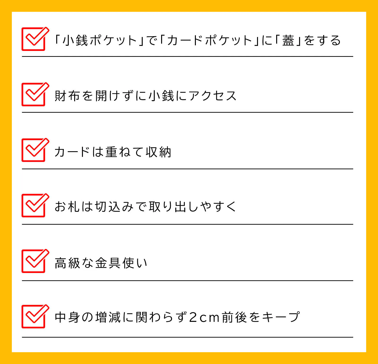 そこで、厚みの出やすい「小銭」・「カード」を重ねることなく、「上下で分ける2層式」のデザインとしました。