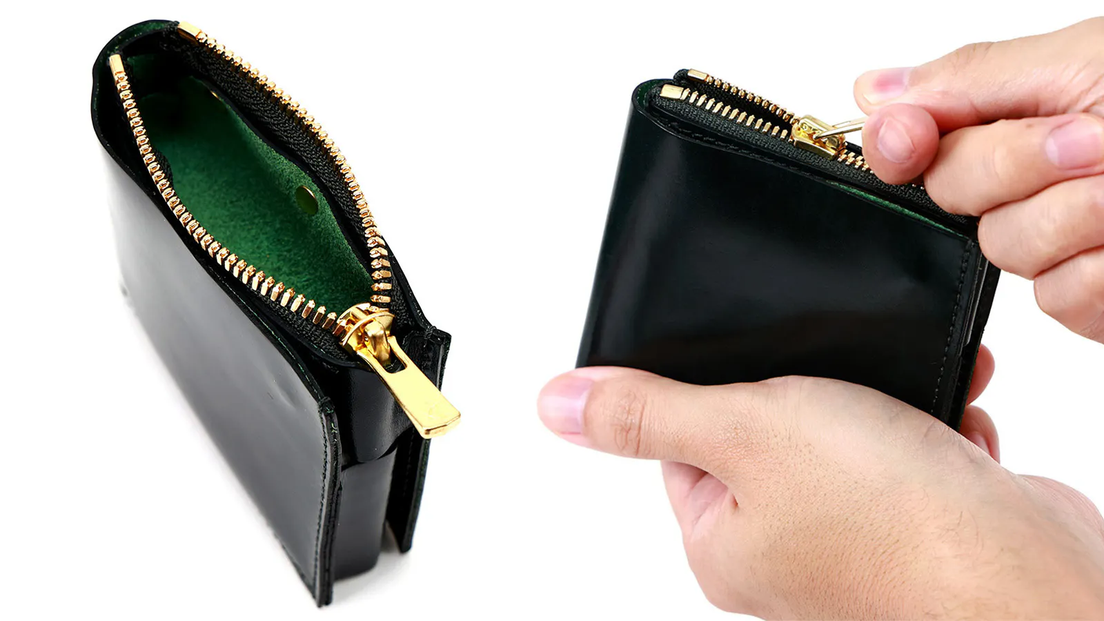 小銭ポケットはを2層式の上部に配置。財布を開かずに、ワンアクションで小銭にアクセスが可能です。ちょっとした配慮として、通常のファスナーについている「ファスナー止め」を排除しました。
