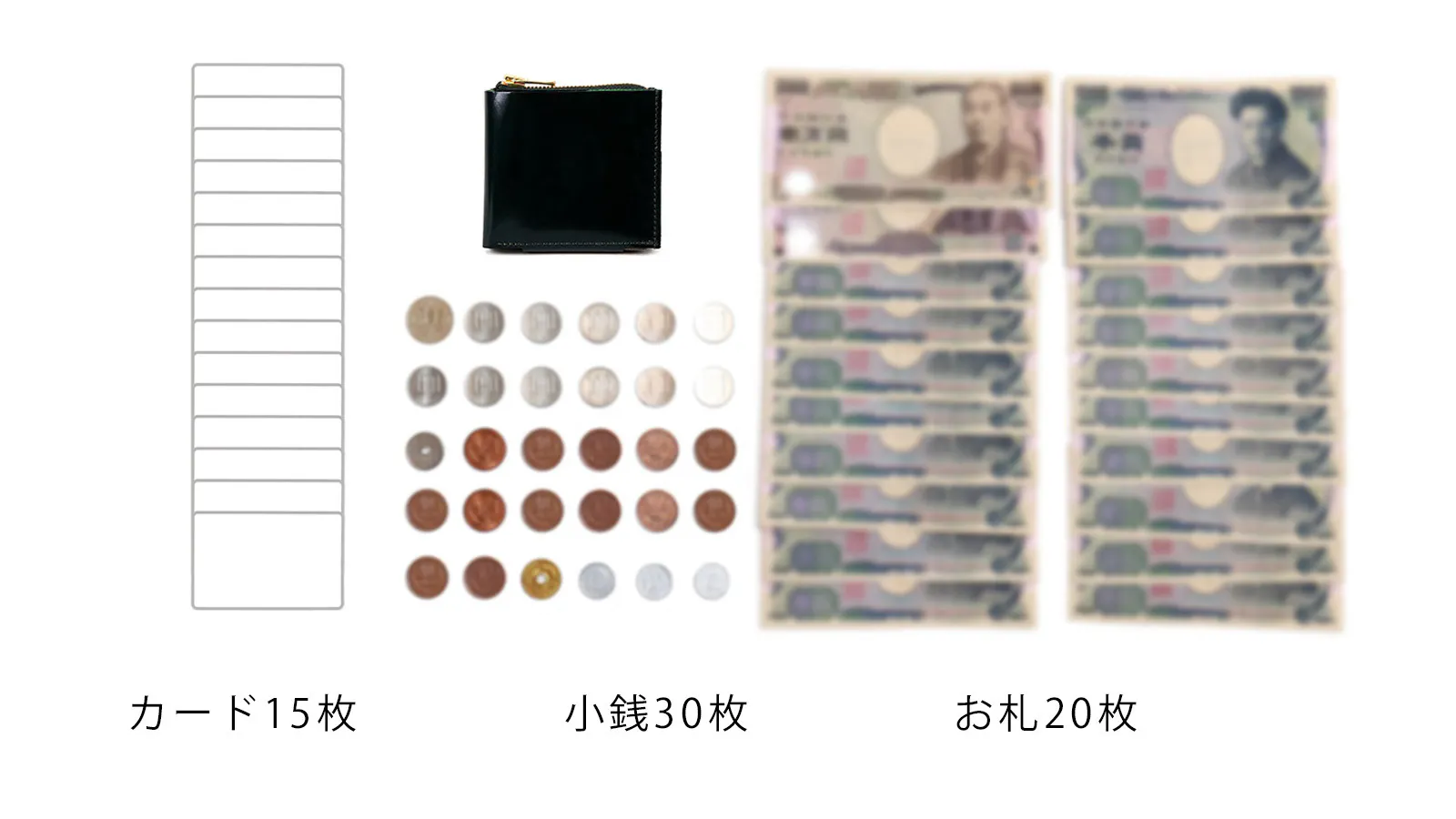 カード15枚・小銭30枚・お札20枚程度が収納できる設計です。