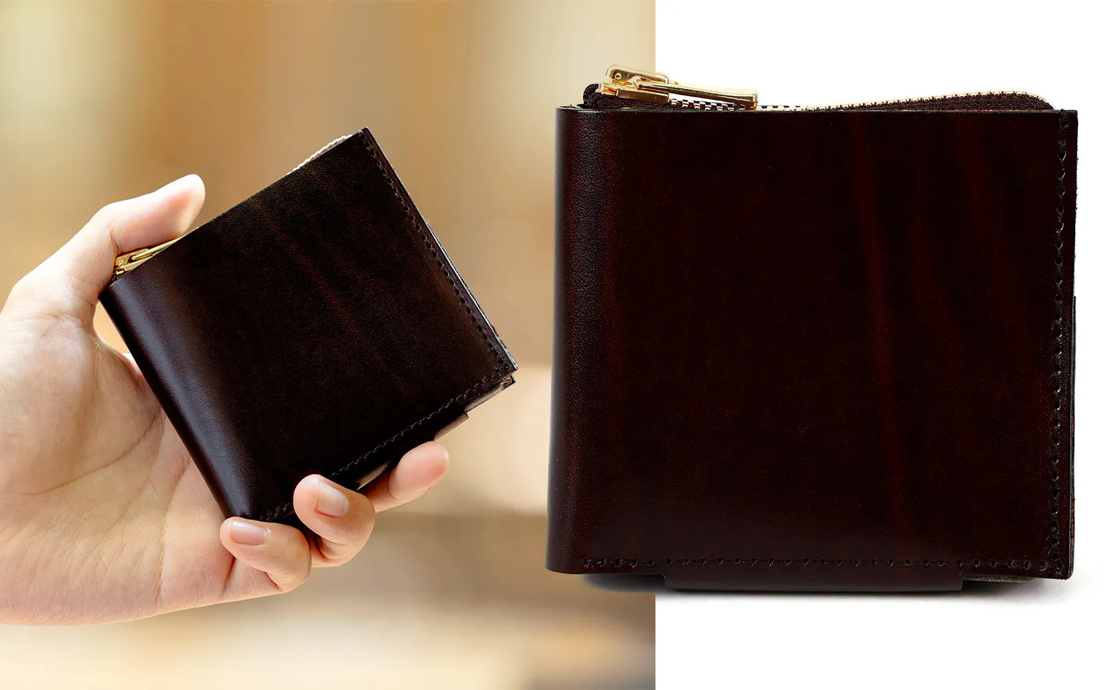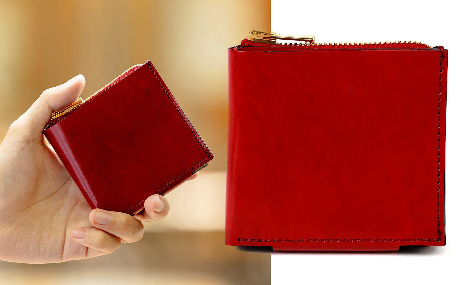 シンプルなスクエアフォルムの2つ折り財布(横開き・お札は上から入る)をベースにしているので、違和感なく使える財布に仕上げました。