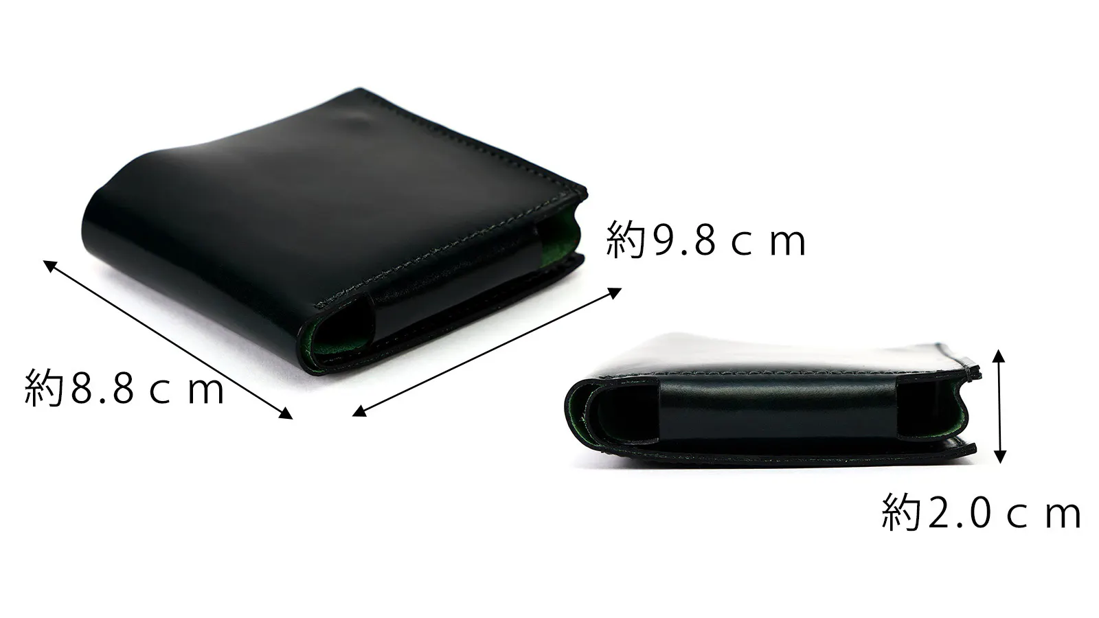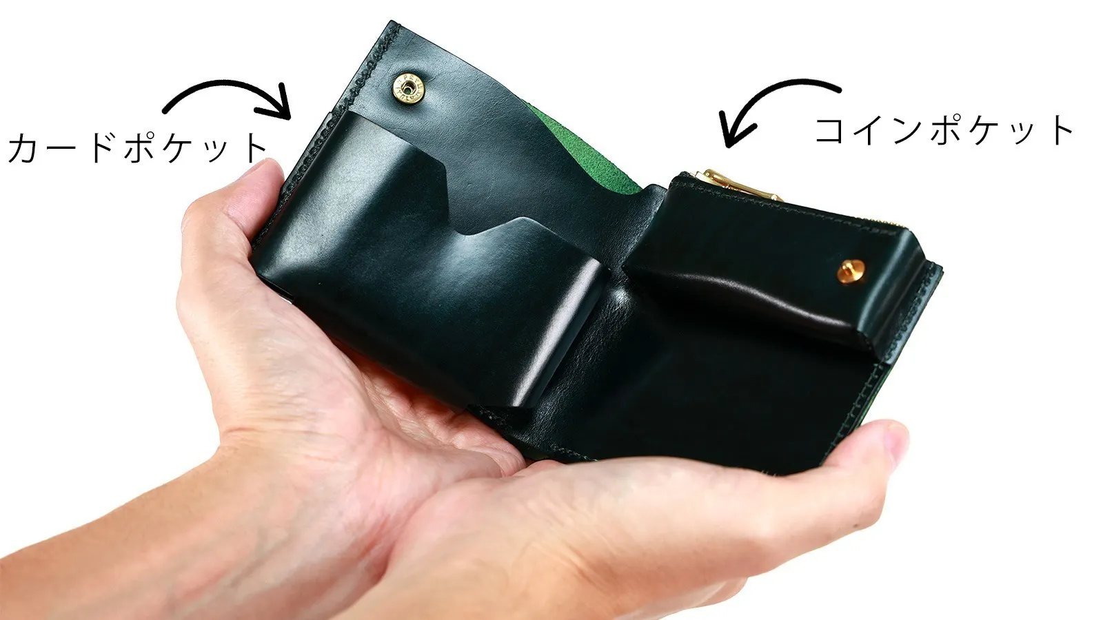 ポケットにもスッキリ収納できる二つ折り財布です。※使い初めは革が硬いため、ふっくらしたフォルムになります。
