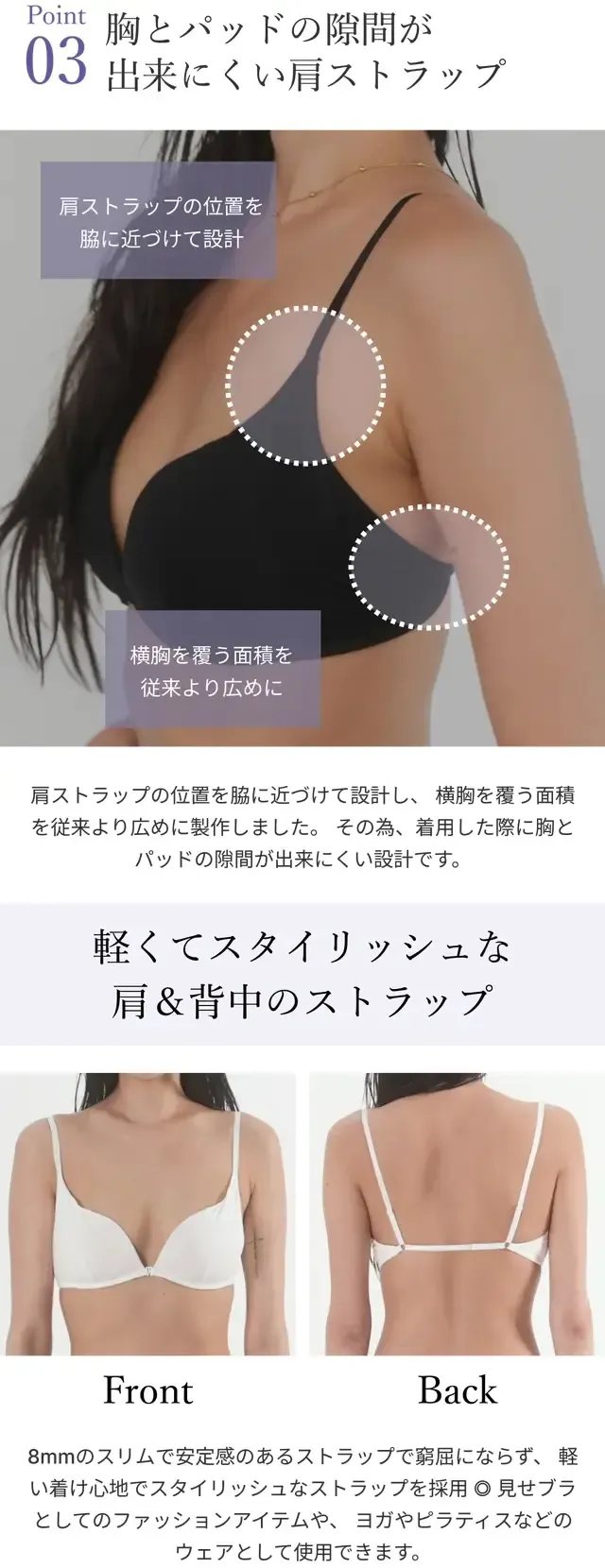 視覚的に空虚感や寂しさがなく、胸を優雅に魅せる設計がされています。逆に見せないともったいないような光沢感とお洒落なストラップが備わっています♪