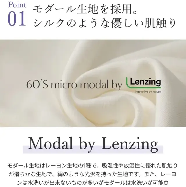 植物由来の素材のため、シルクが合わない人や敏感肌の人でも快適な着心地を体感できます。モーダルは際立つ特徴を沢山持っています。